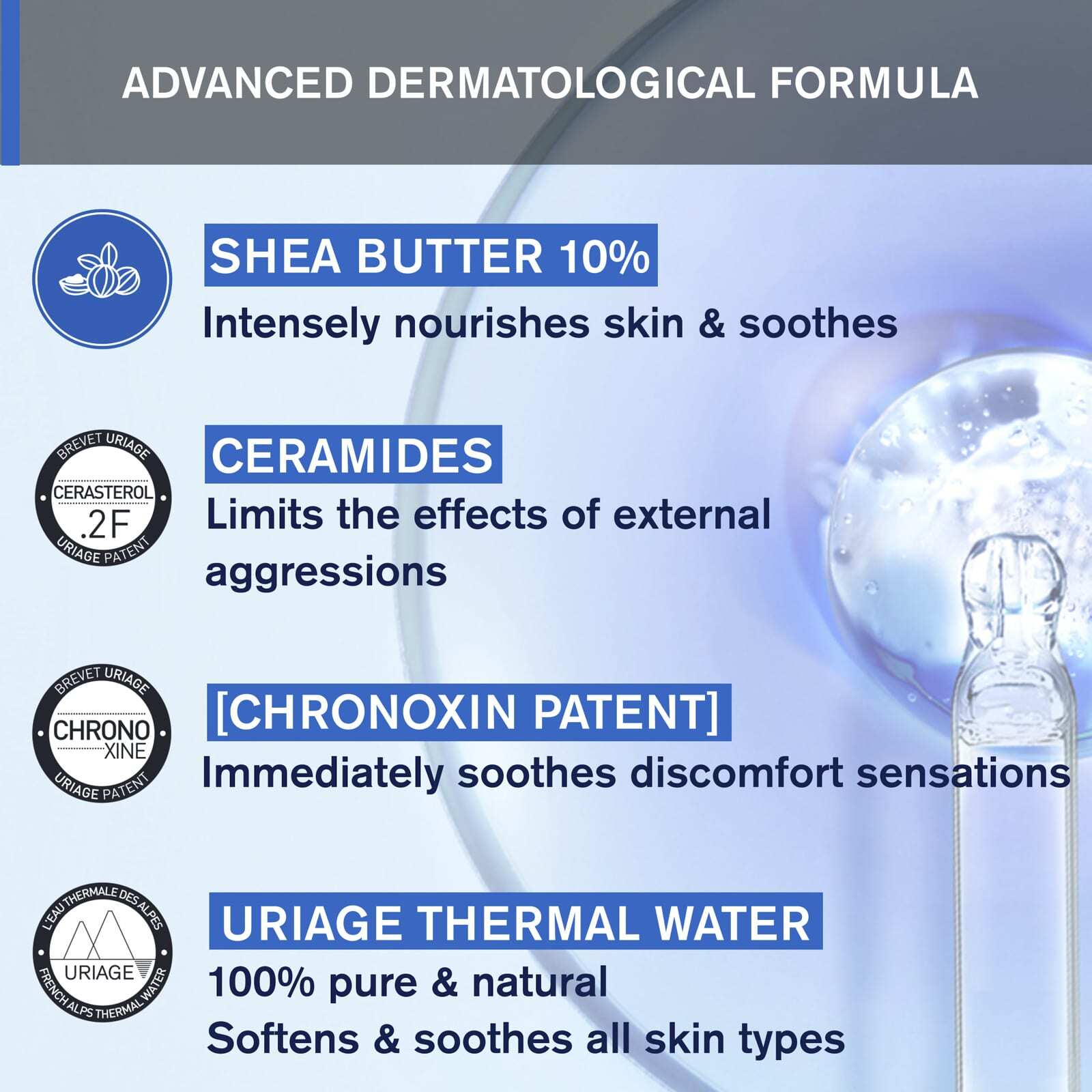 Инновации:Повышенная эффективность за счет комбинации 3 запатентованных комплексов и термальной воды Uriage для тройного барьерного действия: