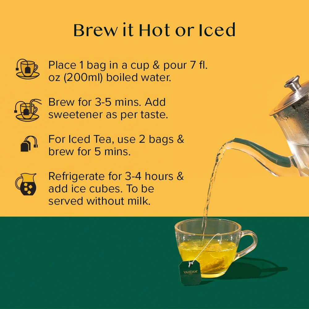 Поместите 1 пакетик в чашку и вылейте 7 жидк. унций. 200 мл (1 унция) кипяченой воды. Заваривайте 3–5 минут. Добавьте подсластитель по вкусу. Для приготовления холодного чая: используйте 2 пакетика и заваривайте в течение 5 минут. Поставьте в холодильник на 3–4 часа и добавьте кубики льда. Подавать без молока.