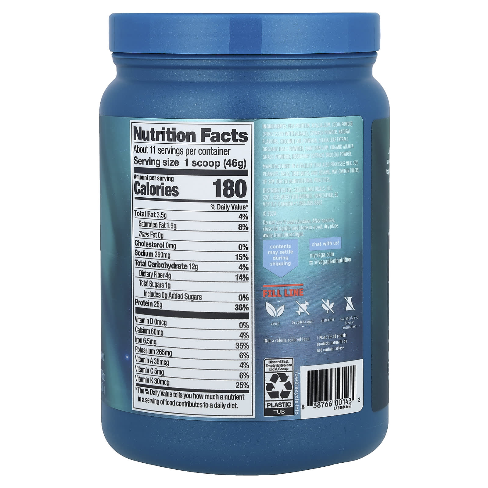 Гороховый протеин, аравийская камедь, какао-порошок (обработанный щелочью), порошок из шпината, натуральные ароматизаторы, порошок из кокосового масла, экстракт листьев стевии, порошок из органической кудрявой капусты, Ксантановая камедь, порошок из органических ростков люцерны, экстракт розмарина, порошок из брокколи.