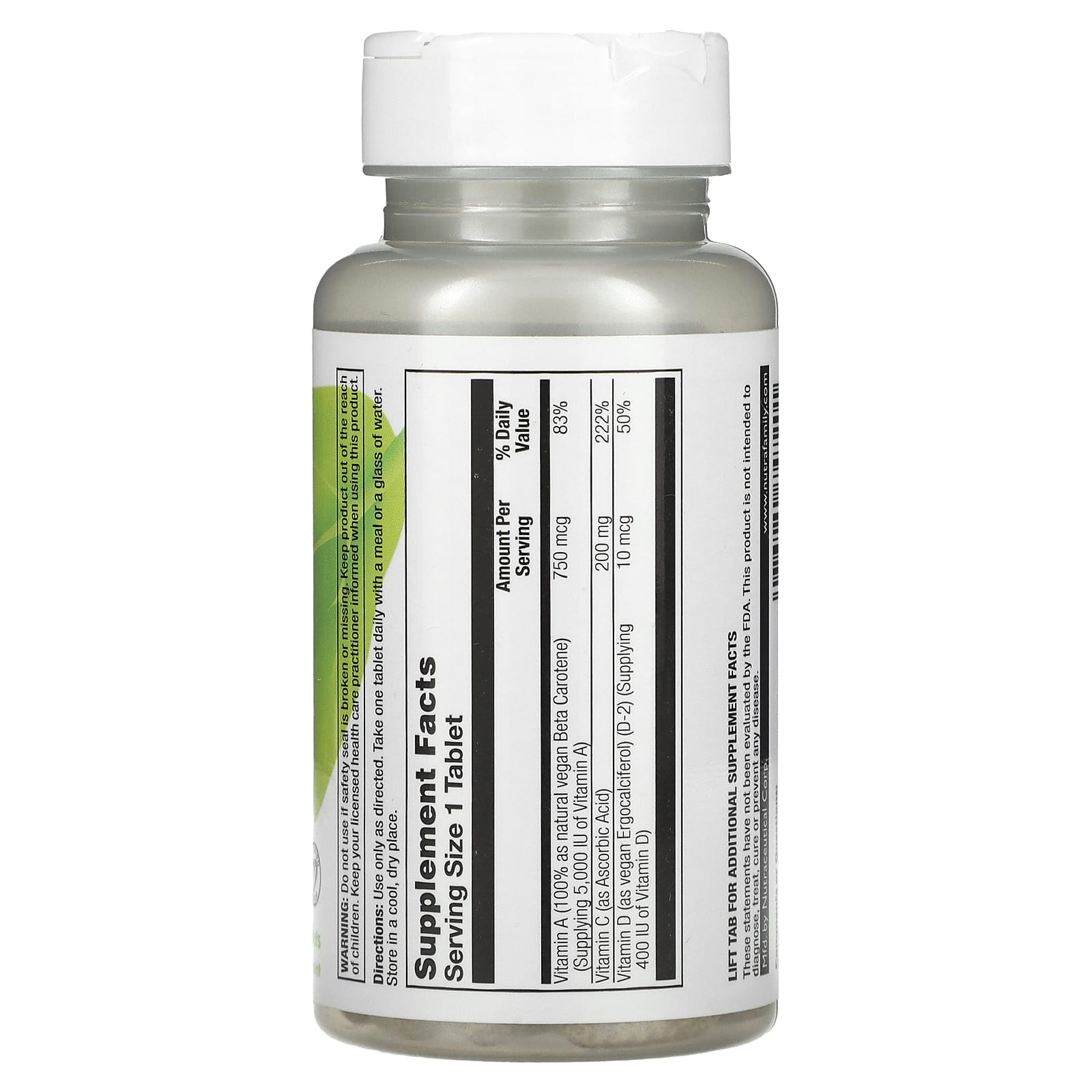 | Витамин A (100% в виде натурального веганского бета-каротина) (источник 5000 МЕ витамина A) | 750 мг | 83% |