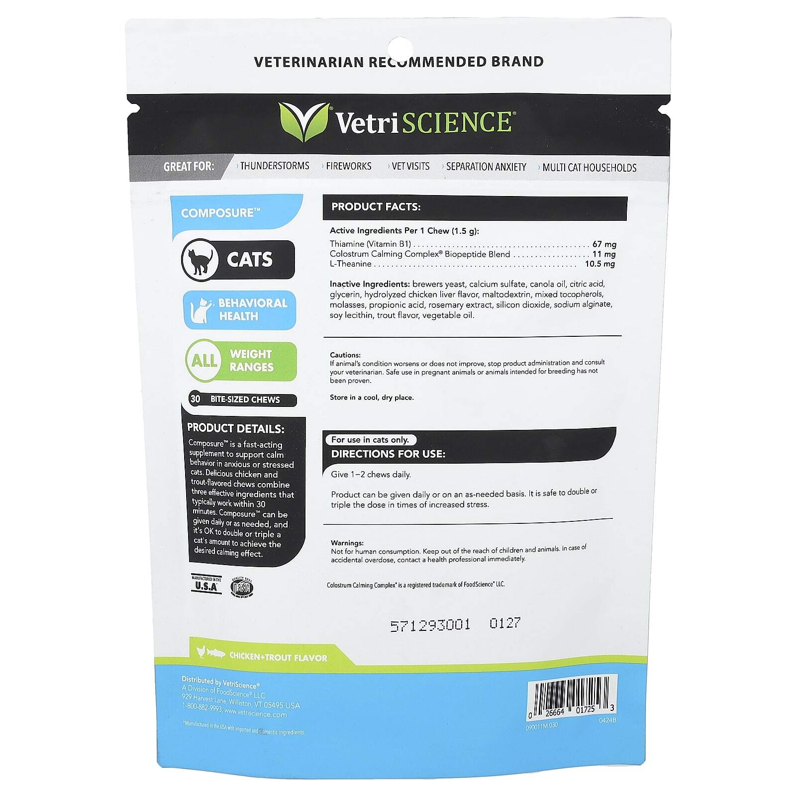 Composure ™ - это добавка быстрого действия для поддержки спокойного поведения у тревожных или подверженных стрессу кошек. Вкусные жевательные блюда со вкусом курицы и форели содержат три эффективных ингредиента, которые обычно действуют в течение 30 минут. Composure ™ можно давать ежедневно или по мере необходимости. Для достижения желаемого успокаивающего эффекта можно удвоить или утроить дозу.