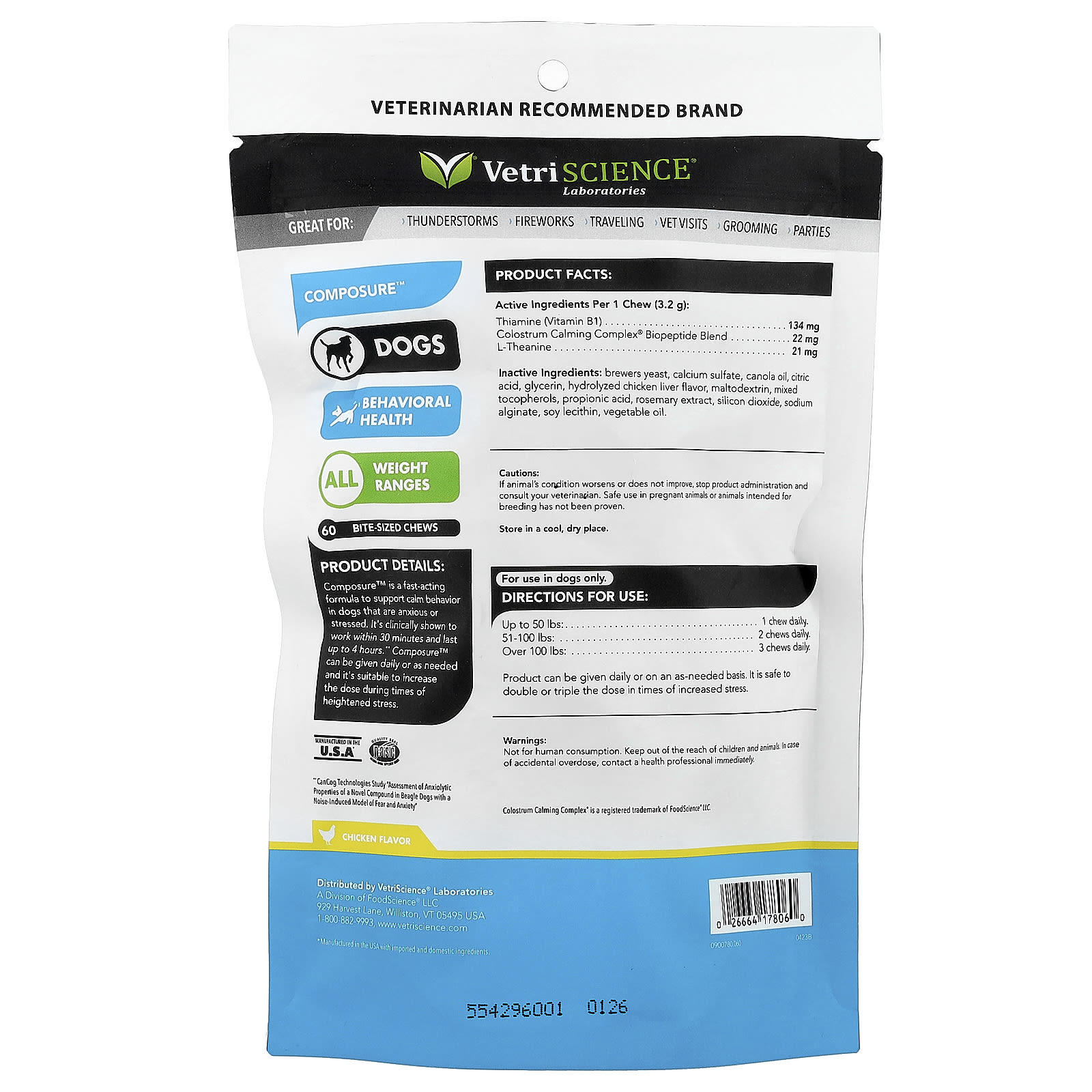 Composure ™ - это быстродействующая формула для поддержки спокойного поведения собак, находящихся в состоянии тревоги или стресса. Клинически доказано, что он действует в течение 30 минут и действует до 4 часов. ** Composure ™ можно принимать ежедневно или по мере необходимости. Дозу можно увеличивать во время повышенного стресса.