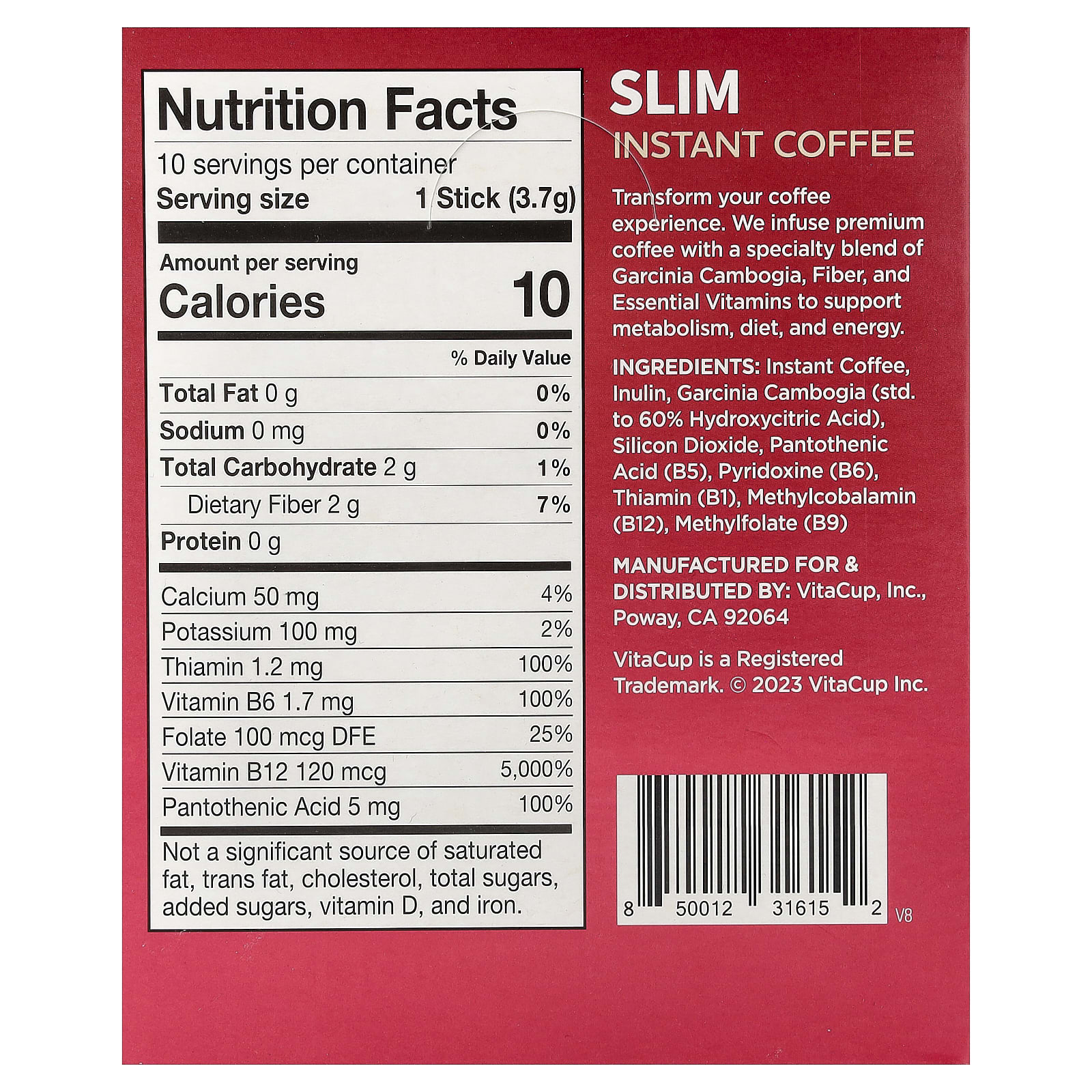 Растворимый кофе, инулин, гарциния камбоджийская (станд. до 60% гидроксилимонной кислоты), диоксид кремния, пантотеновая кислота (витамин B5), пиридоксин (b6), тиамин (b1), метилкобаламин (b12), метилфолат (b9).