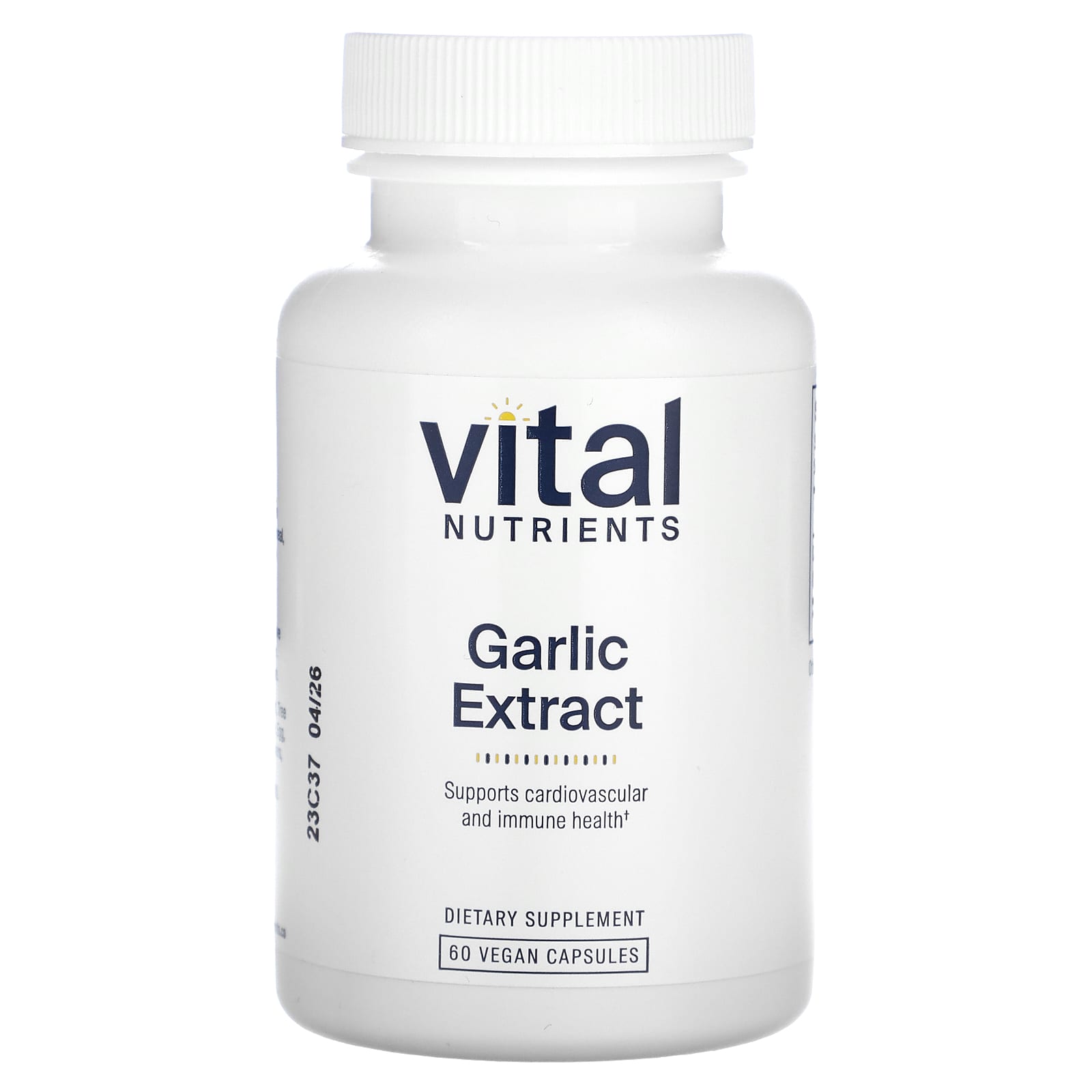 Экстракт чеснока помогает организму поддерживать здоровую сердечно-сосудистую функцию и поддерживать уровень холестерина в пределах нормы. Он также обладает антиоксидантными свойствами и может помочь поддержать иммунную систему. Аллицин является активным ингредиентом чеснока, а экстракт чеснока Vital Nutrients стандартизирован до 1%.
