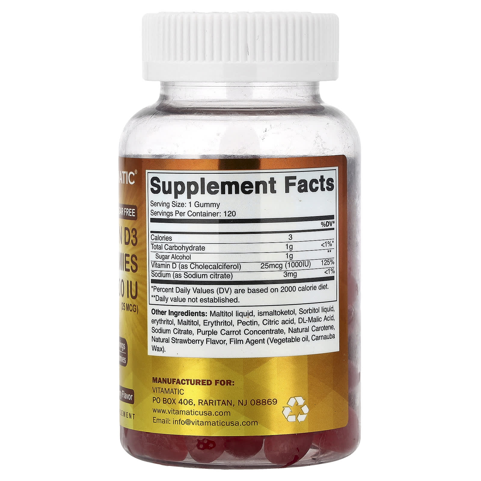 Vitamatic, Жевательные мармеладки с витамином D3, натуральная клубника, 1000 МЕ (25 мкг), 120 жевательных таблеток