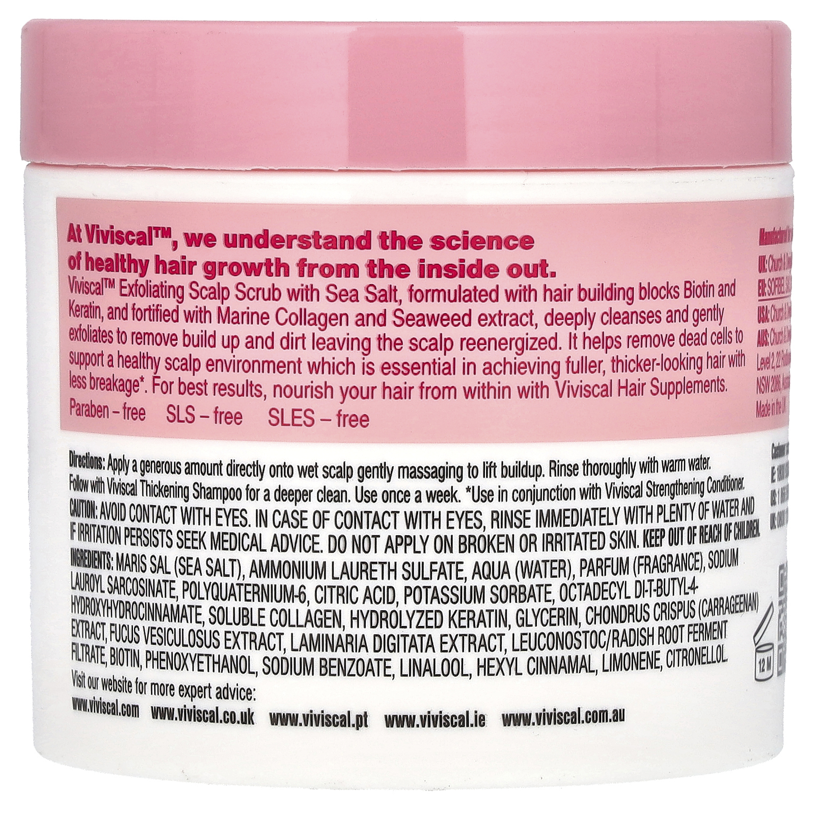 Отшелушивающий скраб для кожи головы с морской солью Viviscal™, в состав которого входят строительные блоки для волос — биотин и кератин, обогащенный морским коллагеном и экстрактом морских водорослей, глубоко очищает и мягко отшелушивает, удаляя загрязнения и загрязнения, насыщая кожу головы энергией. Он помогает удалять омертвевшие клетки, поддерживая здоровую среду для кожи головы, что важно для того, чтобы волосы были более густыми и объемными, а также уменьшали их ломкость. Для достижения наилучших результатов питайте волосы изнутри с помощью добавок для волос Viviscal.