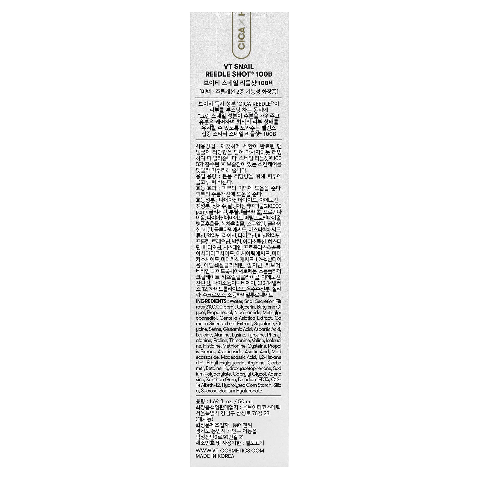 Вода, фильтрат секрета улитки (210 000 част./млн), глицерин, бутилен гликоль, пропандиол, никотинамид, метилпропандиол, экстракт готу колы (Centella asiatica), экстракт листьев зелёного чая (Camellia sinensis), сквалан, giycine, серин, глутаминовая кислота, аспарагиновая кислота, лейцин, аланин, лизин, тирозин, фенилаланин, пролин, треонин, валин, изолейцин, гистидин, метионин, цистеин, экстракт прополиса, азиатикозид, азиатиковая кислота, мадекассосид, мадекассовая кислота, 1,2-гександиол, этилгексилглицерин, аргинин, карбомер, бетаин, гидроксиацетофенон, полиакрилат натрия, каприлилгликоль, аденозин, ксантановая камедь, двунатриевая ЭДТК, c12- 14 алкет-12, гидролизованный кукурузный крахмал, диоксид кремния, сахароза, гиалуронат натрия.