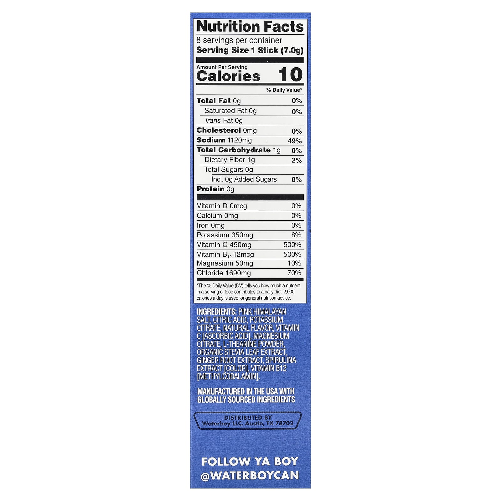 Розовая гималайская соль, лимонная кислота, цитрат калия, натуральный ароматизатор, витамин C [аскорбиновая кислота], цитрат магния, L-теанин в порошке, экстракт листьев органической стевии, экстракт корня имбиря, экстракт спирулины (краситель), витамин B12 [метилкобаламин].