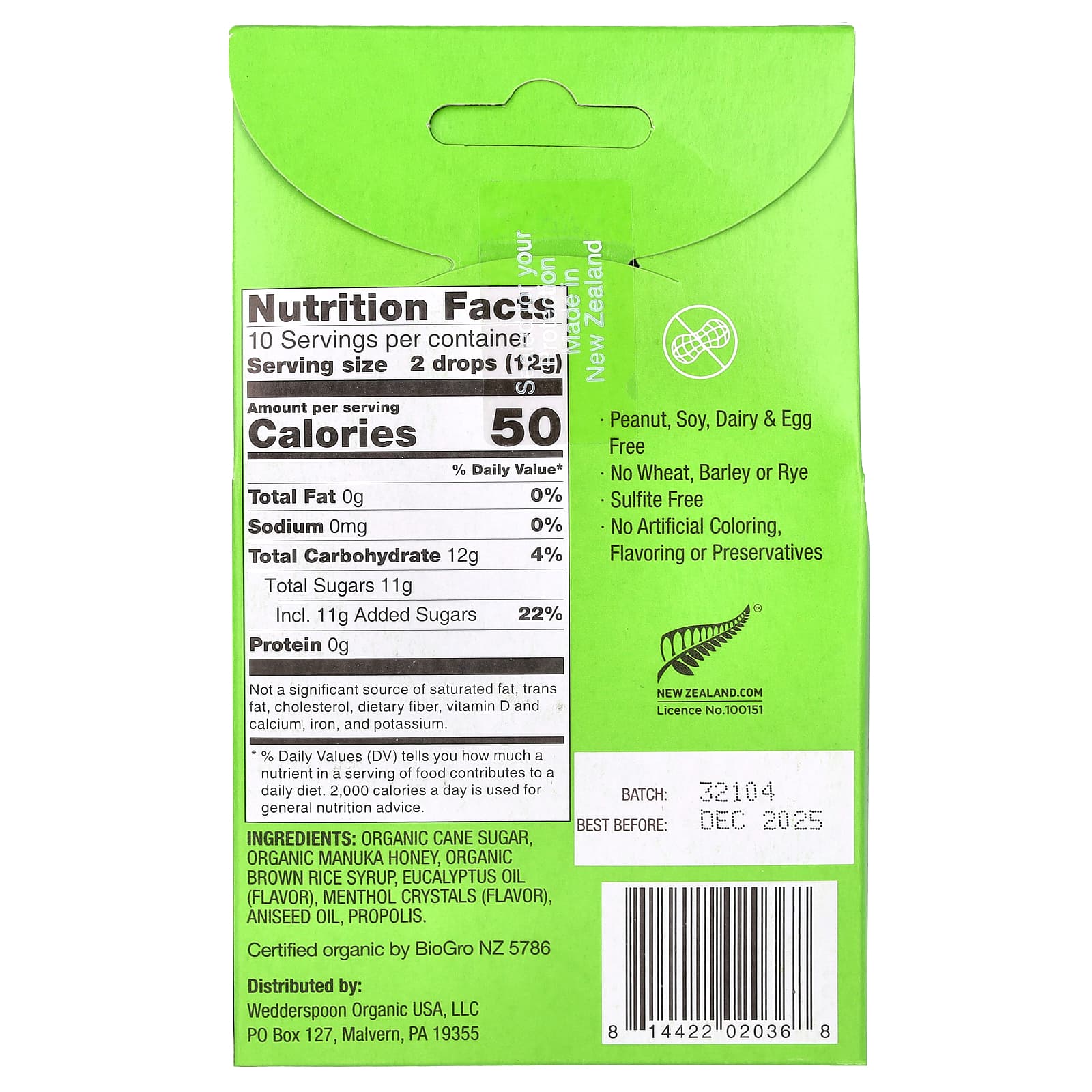 Органический тростниковый сахар, органический мед манука, сироп из органического коричневого риса, масло эвкалипта (eucalyptus globulus) (ароматизатор), кристаллы ментола (ароматизатор), масло из семян аниса (illicium verum), прополис.