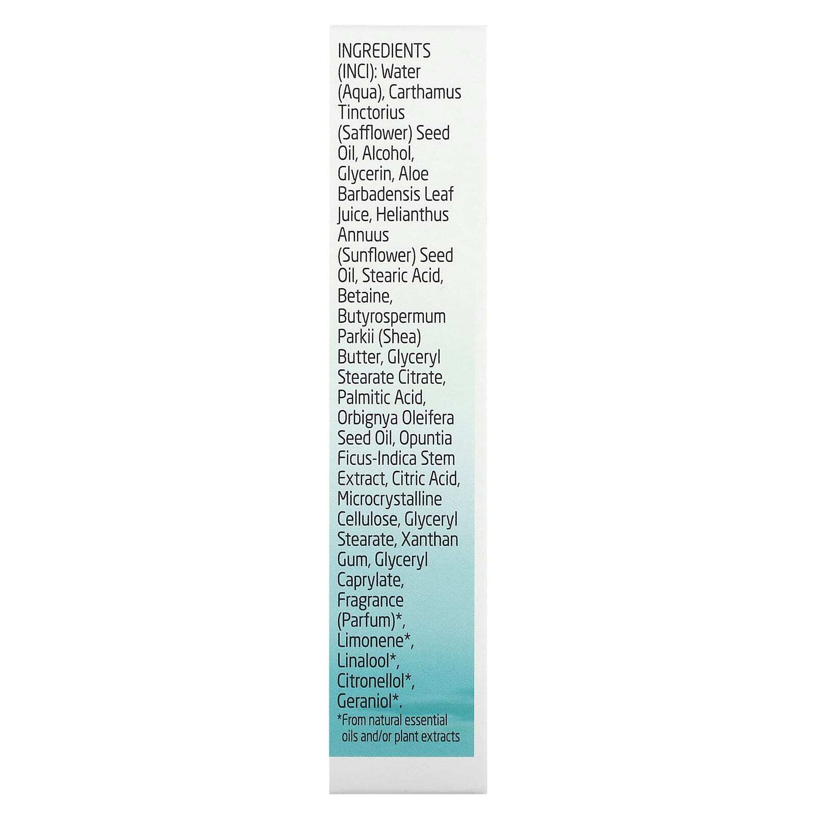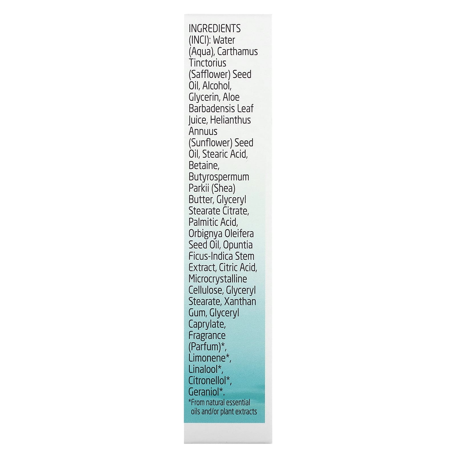 Вода, масло семян сафлора (Carthamus tinctorius), спирт, глицерин, сок листьев алоэ вера (Aloe barbadensis), подсолнечное масло (Helianthus annuus), стеариновая кислота, бетаин, масло ши (Butyrospermum parkii), глицерил стеарат цитрат, пальмитиновая кислота, масло из семян бабассу (Orbignya oleifera), экстракт стеблей опунции индийской (Opuntia ficus-indica), лимонная кислота, микрокристаллическая целлюлоза, глицерил стеарат, ксантановая камедь, глицерил каприлат, отдушка*, лимонен*, линалоол*, цитронеллол*, гераниол*.