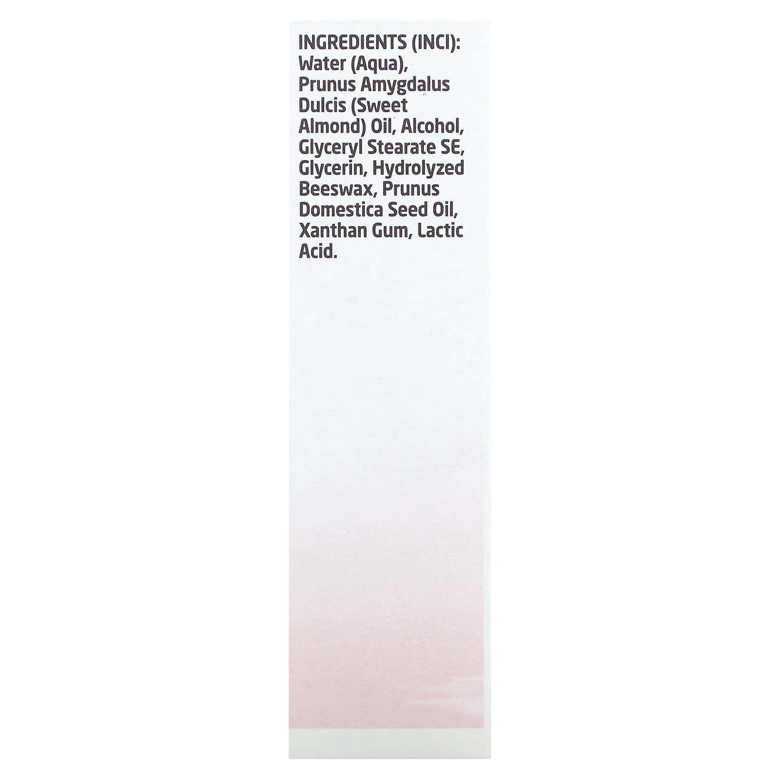 Вода, масло сладкого миндаля (Prunus amygdalus dulcis), спирт, глицерил стеарат эмульгирующий, глицерин, гидролизованный пчелиный воск, масло из сливовых косточек (Prunus domestica), ксантановая камедь, молочная кислота.