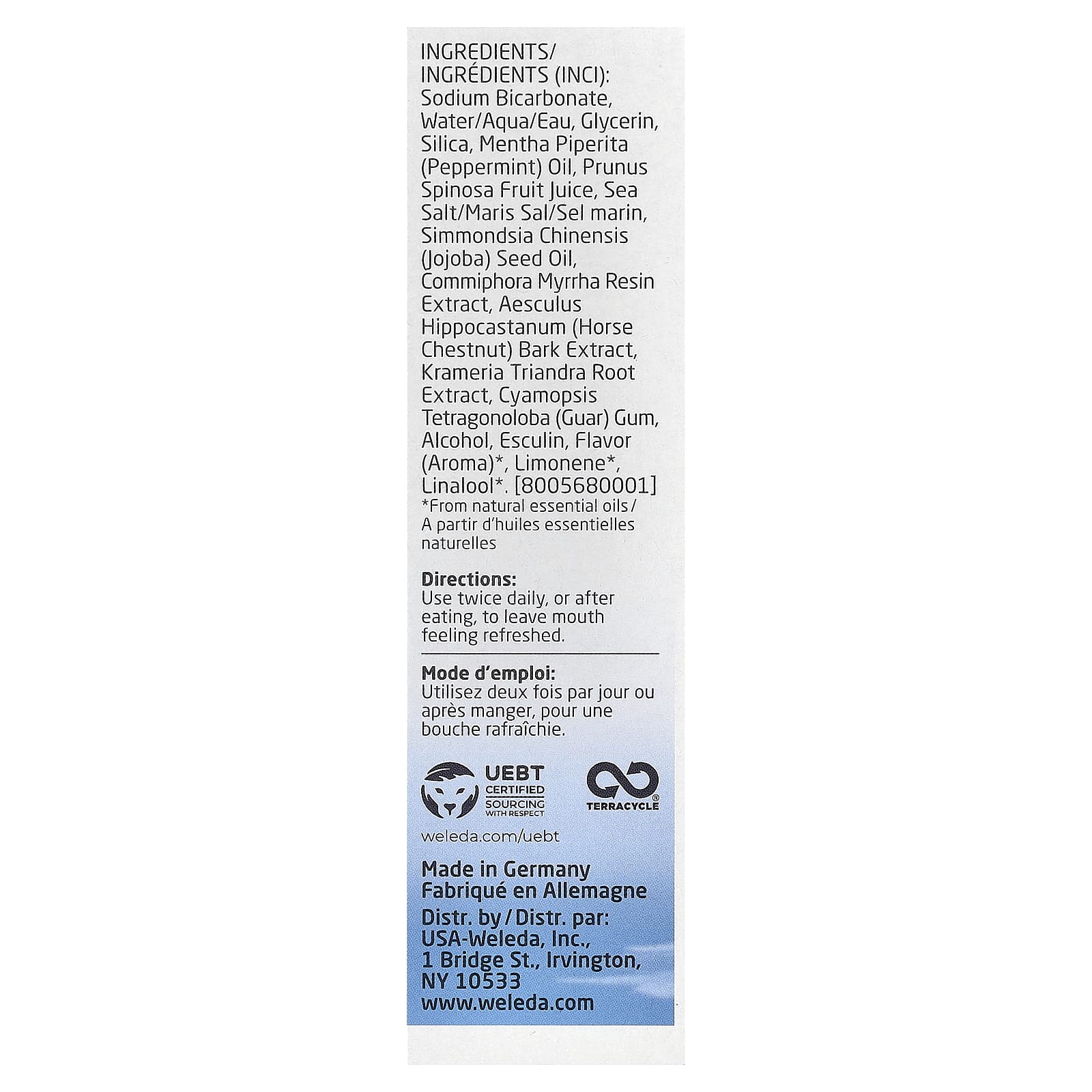 Бикарбонат натрия, вода, глицерин, диоксид кремния, масло перечной мяты (Mentha piperita), фруктовый сок Prunus spinosa, морская соль / марис сал / сел марин, масло из семян жожоба (Simmondsia chinensis), экстракт камеди мирры (Commiphora myrrha), экстракт коры конского каштана (Aesculus hippocastanum), экстракт корня крамерии триандры, гуаровая камедь (Cyamopsis tetragonoloba), спирт, эскулин, вкус (аромат) *, лимонен*, линалоол*.