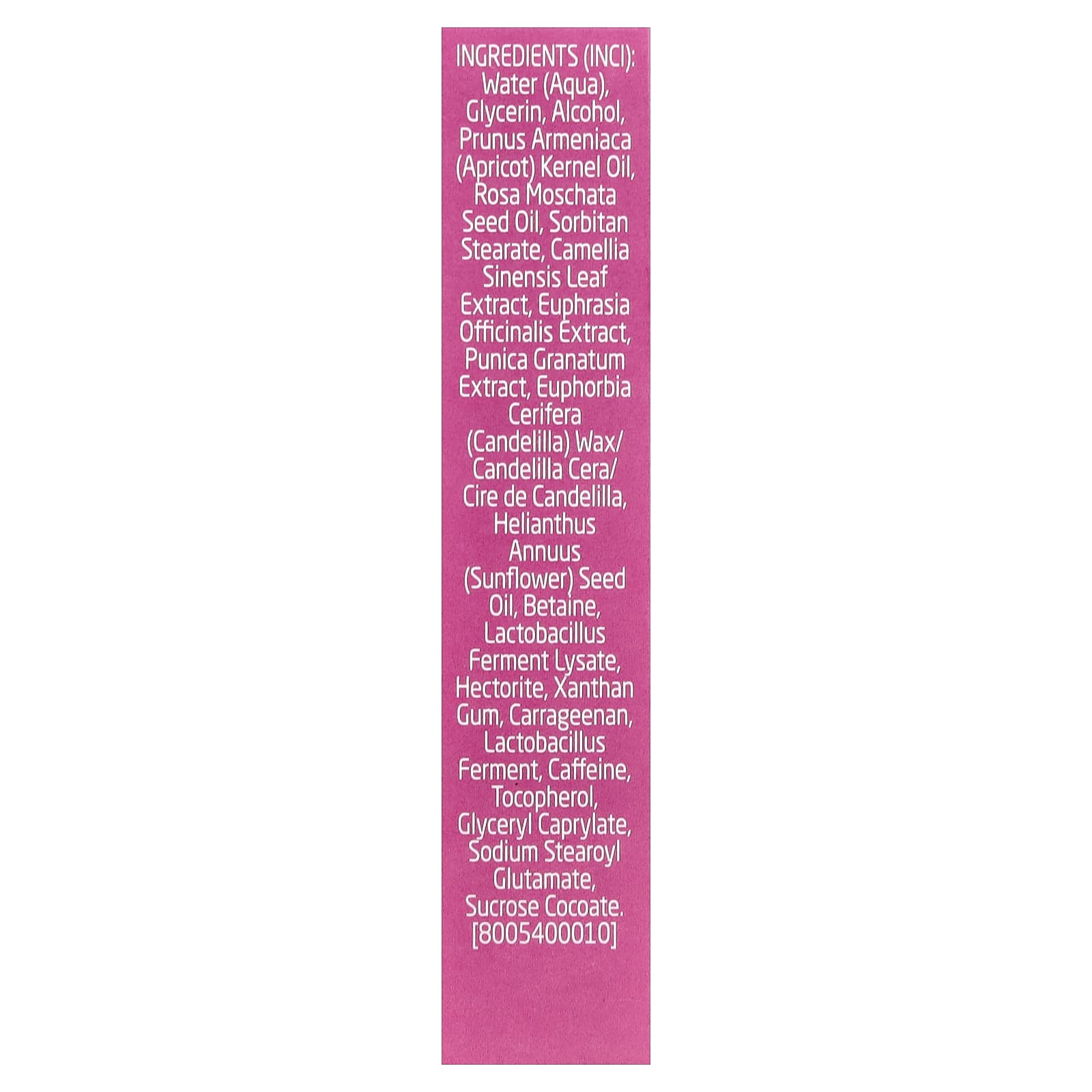 Вода (Aqua), глицерин, спирт, масло из косточек абрикоса (Prunus armeniaca), масло семян шиповника (Rosa moschata), сорбитан стеарат, экстракт листьев зелёного чая (Camellia sinensis), экстракт очанки (Euphrasia officinalis), экстракт граната (Punica granatum), канделильский воск (Euphorbia cerifera), канделильский воск (Euphorbia cerifera), подсолнечное масло (Helianthus annuus), бетаин, лизат продукта ферментации лактобактерий, гекторит, ксантановая камедь, каррагинан, фермент лактобактерий (Lactobacillus), кофеин, токоферол, глицерил каприлат, натрия стеароил глутамат, кокоат сахарозы.