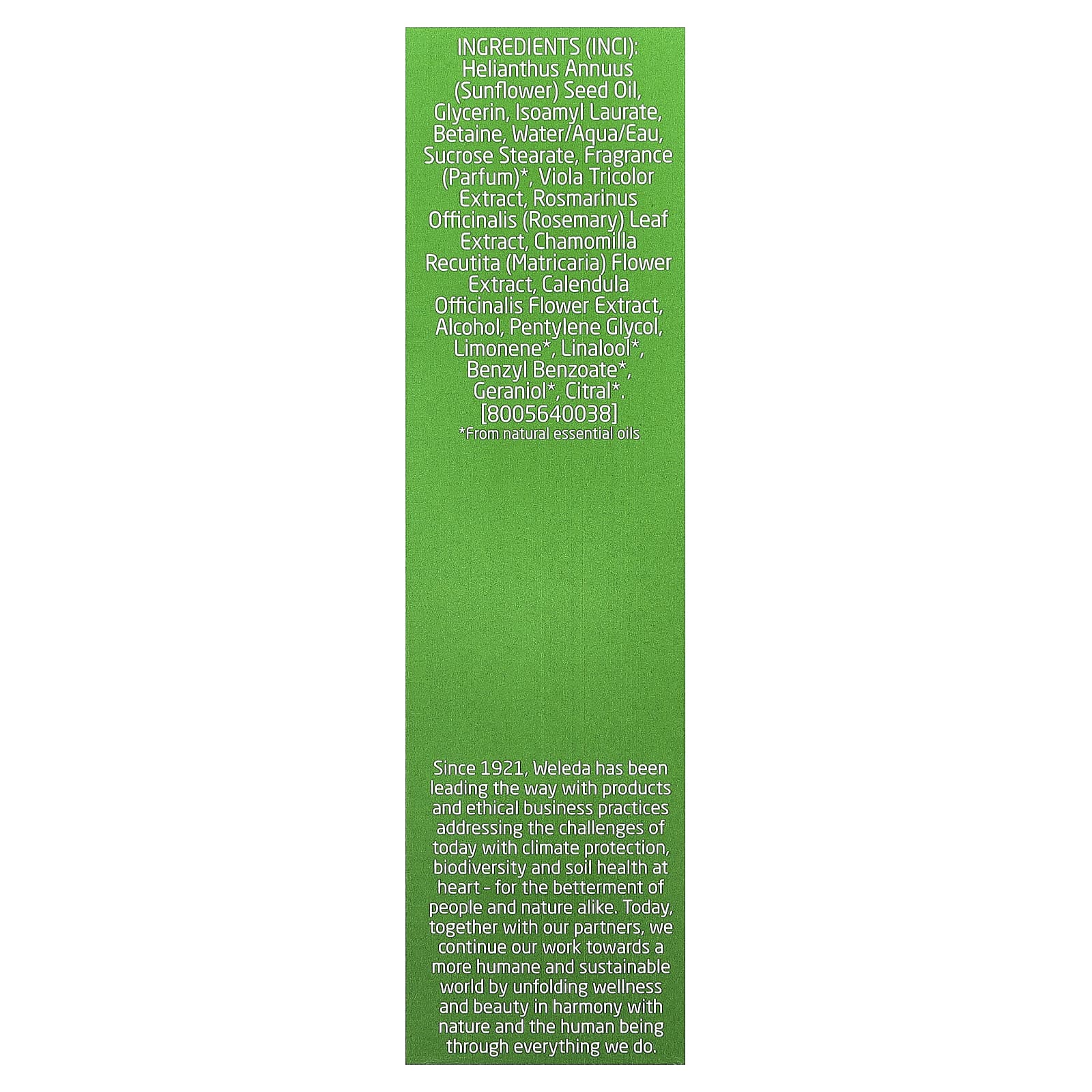 Подсолнечное масло (Helianthus annuus), глицерин, изоамил лаурат, бетаин, вода, стеарат сахарозы, отдушка*, экстракт фиалки трехцветной (Viola tricolor), экстракт листьев розмарина (Rosmarinus officinalis), экстракт цветков ромашки (Chamomilla recutita), экстракт цветков календулы (Calendula officinalis), спирт, пентилен гликоль, лимонен*, линалоол*, бензилбензоат*, гераниол*, цитраль*.