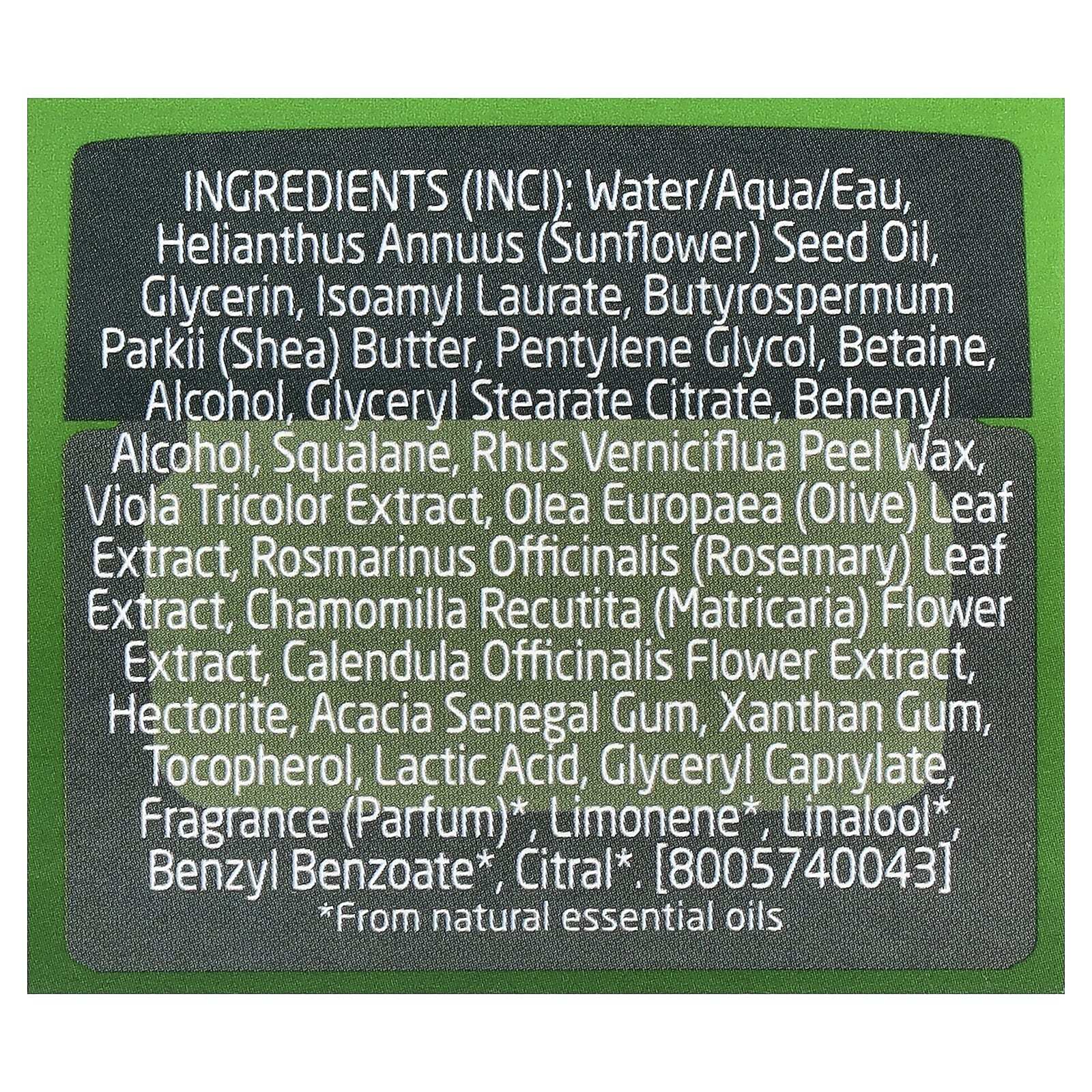 Вода (eau), подсолнечное масло (Helianthus annuus), глицерин, изоамил лаурат, масло ши (Butyrospermum parkii), пентилен гликоль, бетаин, спирт, глицерил стеарат цитрат, бегениловый спирт, сквалан, воск из цедры сумаха (Rhus verniciflua), экстракт фиалки трехцветной (Viola tricolor), экстракт листьев оливкового дерева (Оlea europaea), экстракт листьев розмарина (Rosmarinus officinalis), экстракт цветков ромашки лекарственной (Chamomilla recutita), экстракт цветков календулы (Calendula officinalis), гекторит, смола сенегальской акации (Acacia senegal), ксантановая камедь, токоферол, молочная кислота, глицерил каприлат, отдушка (парфюмерная композиция)*, лимонен*, линалоол бензилбензоат*, цитраль*.