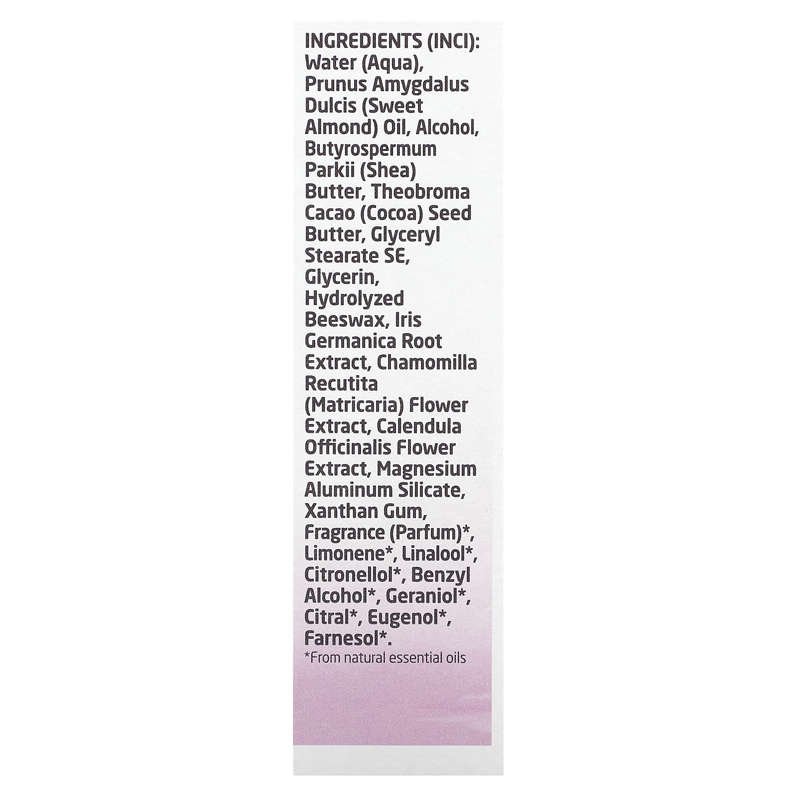 Вода, масло сладкого миндаля (Prunus amygdalus dulcis), спирт, масло ши (Butyrospermum parkii), масло зерен какао (Theobroma cacao), глицерил стеарат эмульгирующий, глицерин, гидролизованный пчелиный воск, экстракт корня ириса германского (Iris germanica), экстракт цветков ромашки лекарственной (Chamomilla recutita), экстракт цветков календулы (Calendula officinalis), алюмосиликат магния, ксантановая камедь, отдушка (парфюмерная композиция)*, лимонен*, линалоол*, цитронеллол*, бензиловый спирт*, гераниол*, цитраль*, эвгенол*, фарнезол*.
