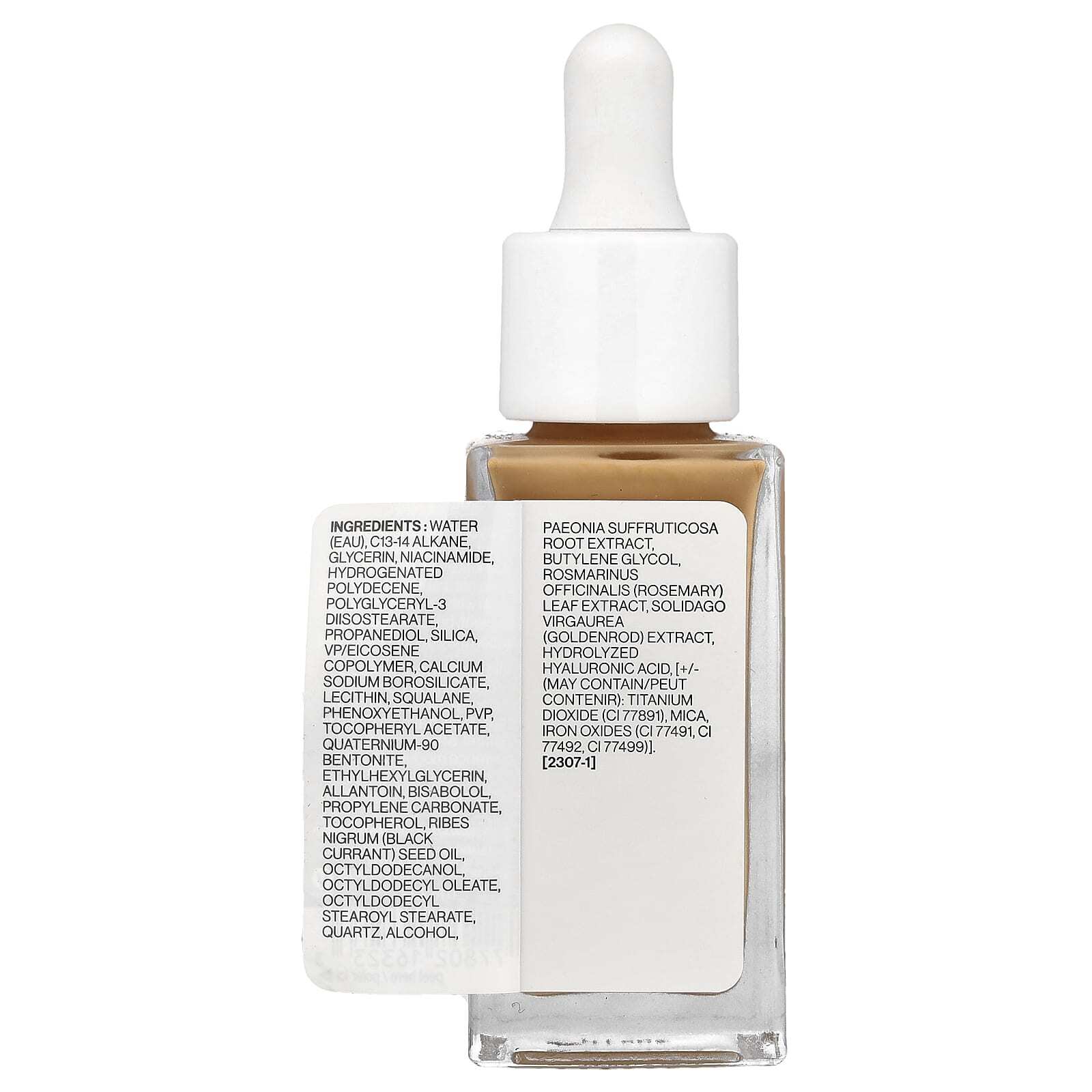 Вода (eau), c13-14 алкан, глицерин, никотинамид, гидрогенизированный полидецен, полиглицерил-3 диизостеарат, пропандиол, диоксид кремния, винилпирролидон/эйкозен сополимер, кальций натрий боросиликат, лецитин, сквалан, феноксиэтанол, ПВП, токоферилацетат, кватерниум-90 бентонит, этилгексилглицерин, аллантоин, бисаболол, пропиленкарбонат, токоферол, масло из косточек черной смородины (Ribes nigrum), октилдодеканол, октилдодецил олеат, октилдодецил стеароил стеарат, кварц, спирт, экстракт корня пиона (Paeonia suffruticosa), бутиленгликоль, экстракт листьев розмарина (Rosmarinus officinalis), экстракт женьшеня (Sidago virgaurea), гидролизованная гиалуроновая кислота, [может содержать: диоксид титана (CI 77891), слюда, оксиды железа (CI 77491, CI 77492, CI 77499).