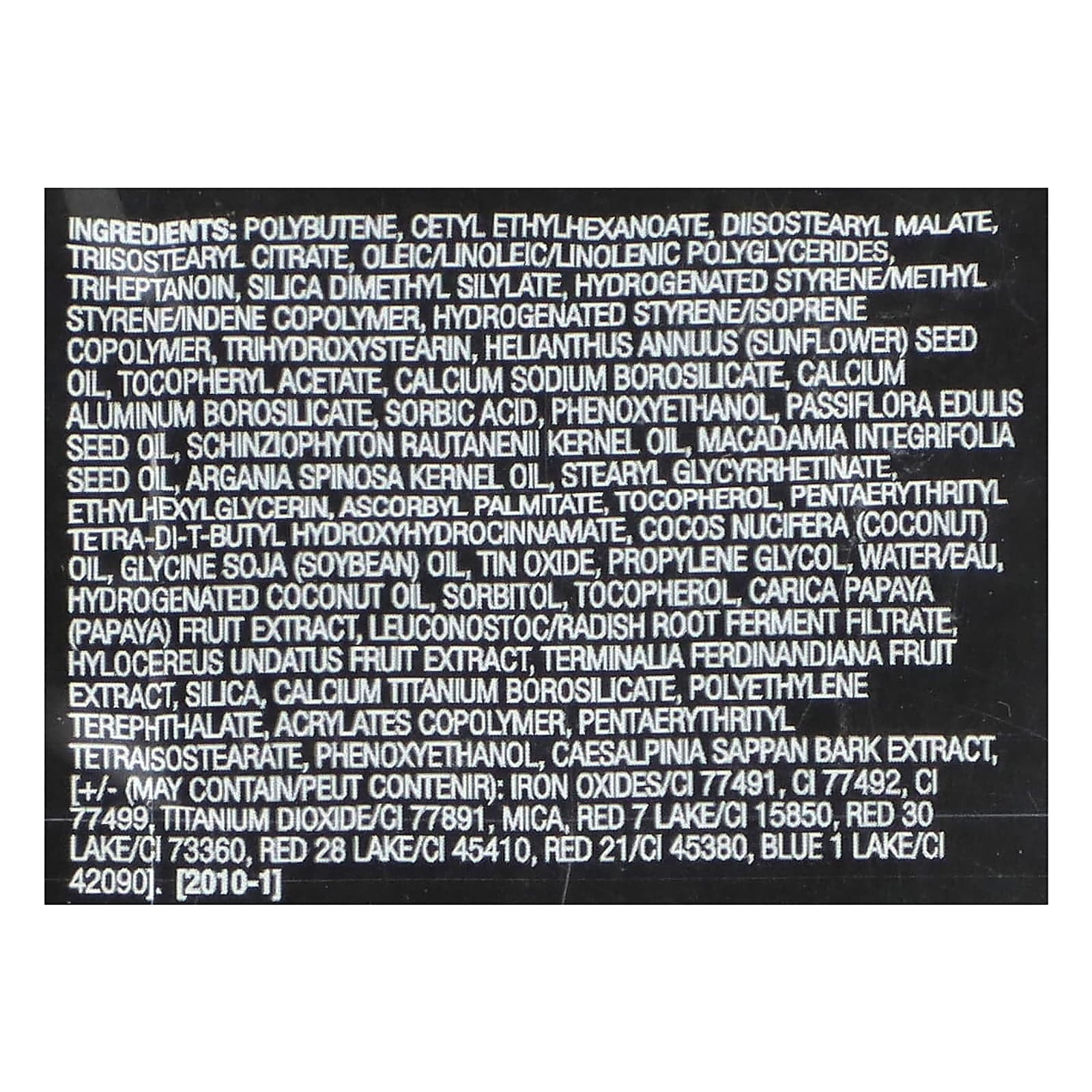 Полибутен, цетилэтилгексаноат, диизостеарил малат, триизостеарил цитрат, олеиновые/линолевые/линоленовые полиглицериды тригептаноин, диметил силилат диоксида кремния, гидрогенизированный сополимер стирола/метилстирола/индена, гидрогенизированный изопренстирольный сополимер, тригидроксистеарин, подсолнечное масло (Helianthus annuus), токоферилацетат, кальций натрий боросиликат, кальций алюминий боросиликат, сорбиновая кислота, феноксиэтанол, масло из семян маракуйи (Passiflora edulis), масло монгонго (schinziophyton rautanenii), масло макадамии (Macadamia integrifolia), аргановое масло (Argania spinosa), стеарил глицирретинат этилгексилглицерин, аскорбил пальмитат., токоферол, пентаэритритил тетра-ди-трет-бутил гидроксигидроциннамат, кокосовое масло (Cocos nucifera), соевое масло (Glycine soja), оксид олова, пропиленгликоль, вода (Eau), гидрогенизированное кокосовое масло, сорбитол, токоферол, экстракт плодов папайи (Carica papaya), лейконосток/ферментированный фильтрат корня редиса, экстракт плодов питахайи (Hylocereus undatus), экстракт плодов сливы какаду (Terminalia ferdinandiana), диоксид кремния, боросиликат кальция и титана, полиэтилентерефталат, сополимер акрилатов, пентаэритритил тетраизостеарат, феноксиэтанол, экстракт коры тары (Caesalpinia sappan), [может содержать оксиды железа (CI 77491), CI 77492, CI 77499), диоксид титана (CI 77891), слюда, краситель красный 7 лак (CI 15850), краситель красный 30 лак/CI 73360, краситель красный 28 лак (CI 45410), краситель красный 21 (CI 45380), краситель синий 1 лак (CI 42090).
