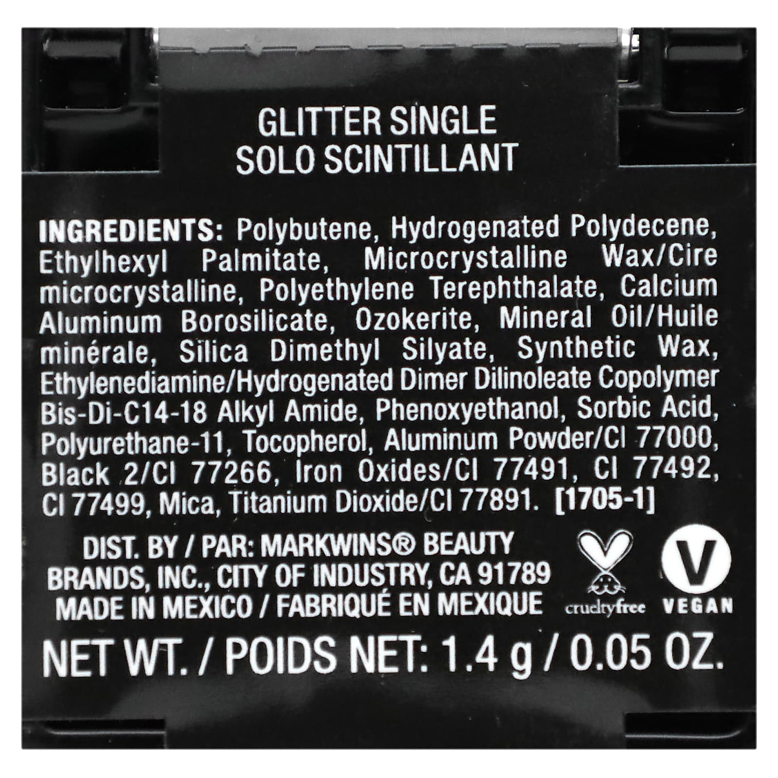 Полибутен, гидрогенизированный полидецен, этилгексил пальмитат, микрокристаллический воск (Cera microcristallina), полиэтилентерефталат, кальций алюминий боросиликат, озокерит, минеральное масло, диметил силилат диоксида кремния, синтетический воск, этилендиамин/гидрированный димер дилинолеат сополимер бис-ди-c14-18 алкиламида, феноксиэтанол, сорбиновая кислота, полиуретан-11, токоферол, алюминиевый порошок/CI 77000, краситель черный 2 (CI 77266), оксиды железа (CI 77491), CI 77492, CI 77499), слюда, диоксид титана (CI 77891).