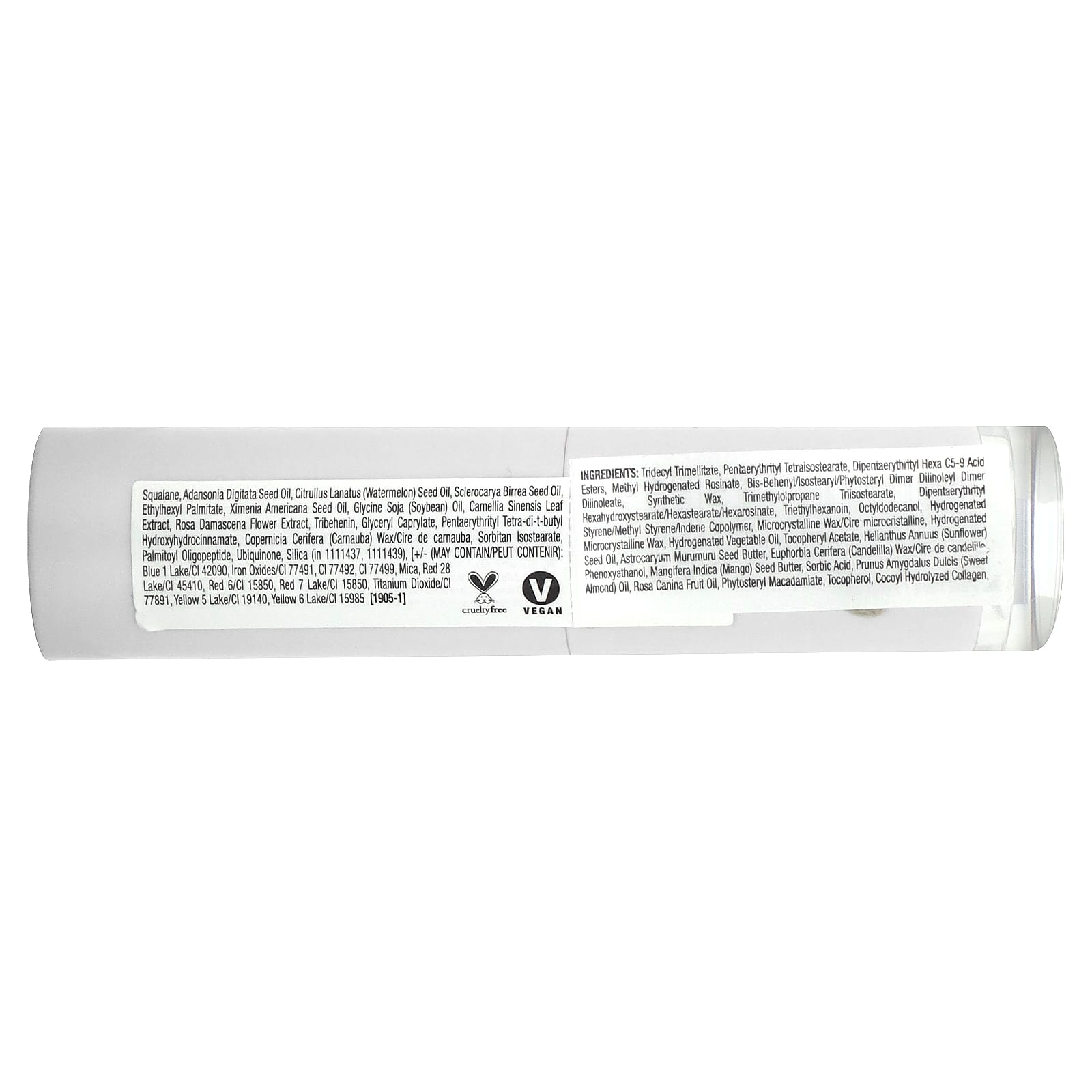 Тридецил тримеллитат, пентаэритритил тетраизостеарат, дипентаэритритил гекса C5-9 кислоты, метил-гидрогенизированный розинат, бис-бегенил/изостеарил/фитостерил димер дилинолеил димер дилинолеат, синтетический воск, триметилолпропан триизостеарат, дипентаэритритил гексагидроксистеорат/гексастерат/гексаросинат, триэтилгексаноин, октилдодеканол, гидрогенизированный сополимер стирола/метилстирола/индена, микрокристаллический воск, гидрогенизированный микрокристаллический воск, гидрогенизированное растительное масло, токоферилацетат, подсолнечное масло (Helianthus annuus), масло семян мурумуру (Astrocaryum murumuru), канделильский воск (Euphorbia cerifera), феноксиэтанол, масло косточек манго (Mangifera indica), сорбиновая кислота, масло сладкого миндаля (Prunus amygdalus dulcis), масло шиповника (Rosa canina), фитостерил макадамиат, токоферол, кокоил гидролизованный коллаген, сквалан, масло из семян баобаба (Adansonia digitata), масло из семян арбуза (Citrullus lanatus), масло семян марулы (Sclerocarya birrea), этилгексил пальмитат, масло из семян ксимении американской (Ximenia americana), соевое масло (Glycine soja), экстракт листьев зеленого чая (Camellia sinensis), экстракт цветков дамасской розы (Rosa damascena), трибехенин, глицерил каприлат, пентаэритритил тетра-ди-трет-бутил гидроксигидроциннамат, карнаубский воск (Copernicia cerifera), сорбитан изостеарат, пальмитоил олигопептид, убихинон, диоксид кремния (в количестве 1111437,1111439), [+/- (может содержать): blue 1 lake / CI 42090, оксиды железа (CI 77491, CI 77492, CI 77499), слюду, краситель красный 28 лак (CI 45410), красный 6 / CI 15850, краситель красный 7 лак (CI 15850), диоксид титана (CI 77891), краситель желтый 5 лак (CI 19140), желтый 6 лак / CI 15985.