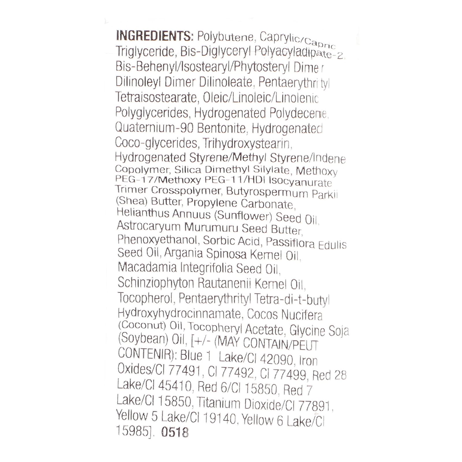 Полибутен, каприловый/каприновый триглицерид, бис-диглицерил полиациладипат-2 бис-бегенил/изостеарил/фитостерил димер дилинолеил димер дилинолеат, пентаэритритил тетраизостеарат, олеиновые/линолевые/линоленовые полиглицериды, гидрогенизированный полидецен кватерний-90 бентонит, гидрогенизированные кокоглицериды, тригидроксистеарин, гидрогенизированный сополимер стирола/метилстирола/индена, диметил силилат диоксида кремния, метокси ПЭГ-17/метокси ПЭГ-11/гександиизоцианат изоцианурат/тример кроссполимер, масло ши (Butyrospermum parkii), пропиленкарбонат, подсолнечное масло (Helianthus annuus), масло семян мурумуру (Astrocaryum murumuru), феноксиэтанол, сорбиновая кислота, масло из семян маракуйи (Passiflora edulis), аргановое масло (Argania spinosa), масло макадамии (Macadamia integrifolia), масло монгонго (schinziophyton rautanenii), токоферол, пентаэритритил тетра-ди-трет-бутил гидроксигидроциннамат, кокосовое масло (Cocos nucifera), токоферилацетат, соевое масло (Glycine soja), [может содержать краситель синий 1 лак (CI 42090), оксиды железа (CI 77491, CI 77492, CI 77499), краситель красный 28 лак (CI 45410), краситель красный 6 (CI 15850), краситель красный 7 лак (CI 15850), диоксид титана (CI 77891), краситель желтый 5 лак/CI 19140. желтый 6 лак/CI 15985].