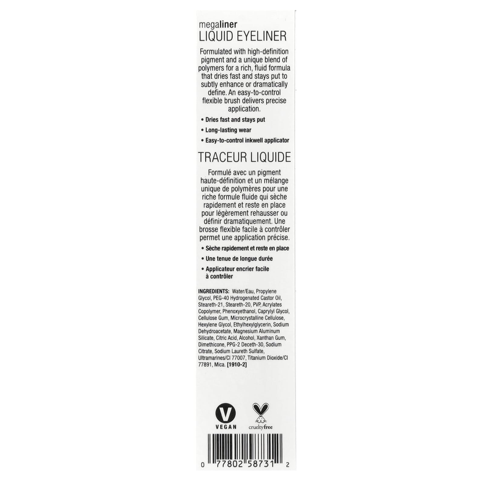 Содержит высококачественный пигмент и уникальную смесь полимеров для создания насыщенного жидкого средства, которое быстро высыхает и держится, слегка улучшая или резко подчеркивая оттенки. Легко контролируемая гибкая кисть обеспечивает точное нанесение.