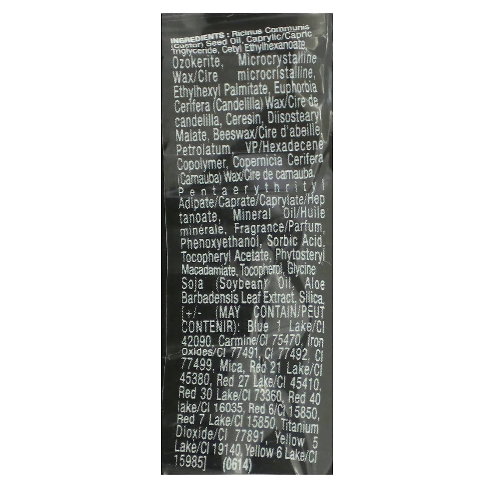 Касторовое масло (Ricinus communis), каприловый/каприновый триглицерид, цетилэтилгексаноат, озокерит, микрокристаллический воск, этилгексил пальмитат, канделильский воск (Euphorbia cerifera), церезин, диизостеарил малат, пчелиный воск, вазелин, ВП/гексадецен сополимер, карнаубский воск (Copernicia cerifera), пентаэритритил адипат/капрат/каприлат/гептаноат, минерального масла, отдушка, феноксиэтанол, сорбиновая кислота, токоферилацетат, фитостерил макадамиат, токоферол, соевое масло (Glycine soja), экстракт листьев алоэ вера (Aloe barbadensis), диоксид кремния, [может содержать краситель синий 1 лак (CI 42090), кармин (CI 75470), оксиды железа (CI 77491, CI 77492, 77499, слюда, краситель красный 21 лак/CI) 45380, краситель красный 27 лак (CI 45410), краситель красный 30 лак/CI 73360, краситель красный 40 лак (CI 16035), краситель красный 6 (CI 15850), краситель красный 7 лак (CI 15850), диоксид титана (CI 77891), краситель желтый 5 лак (CI 19140), краситель желтый 6 лак (CI 15985)].