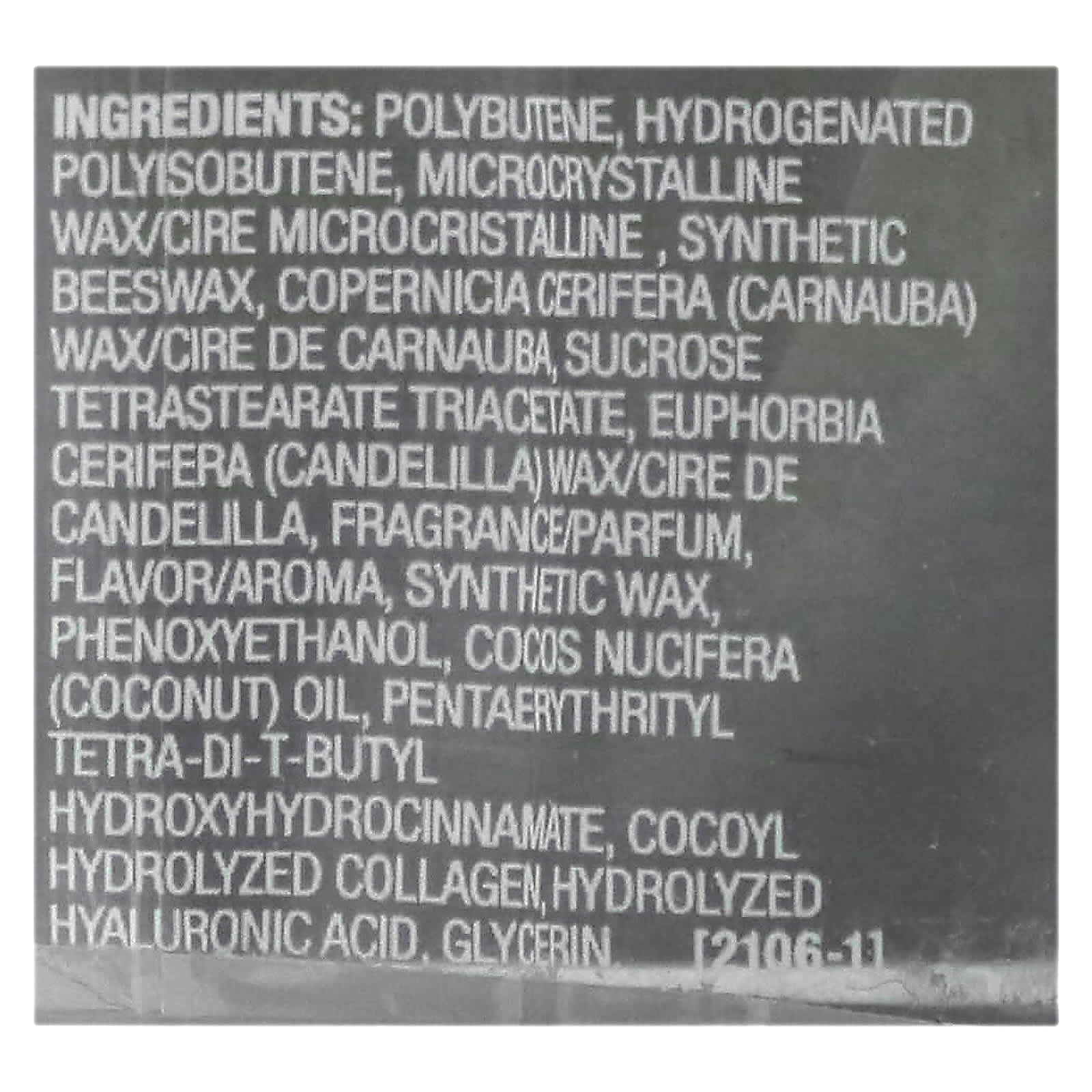 Полибутен, гидрогенизированный полиизобутен, микрокристаллический воск, синтетический воск, карнаубский воск (Copernicia cerifera), тетрастеарат триацетат сахарозы, канделильский воск (Euphorbia cerifera), отдушка (парфюмерная композиция), ароматизатор, синтетический воск, феноксиэтанол, кокосовое масло (Cocos nucifera), пентаэритритил тетра-ди-трет-бутил гидроксигидроциннамат, кокоил гидролизованный коллаген, гидролизованная гиалуроновая кислота, глицерин.