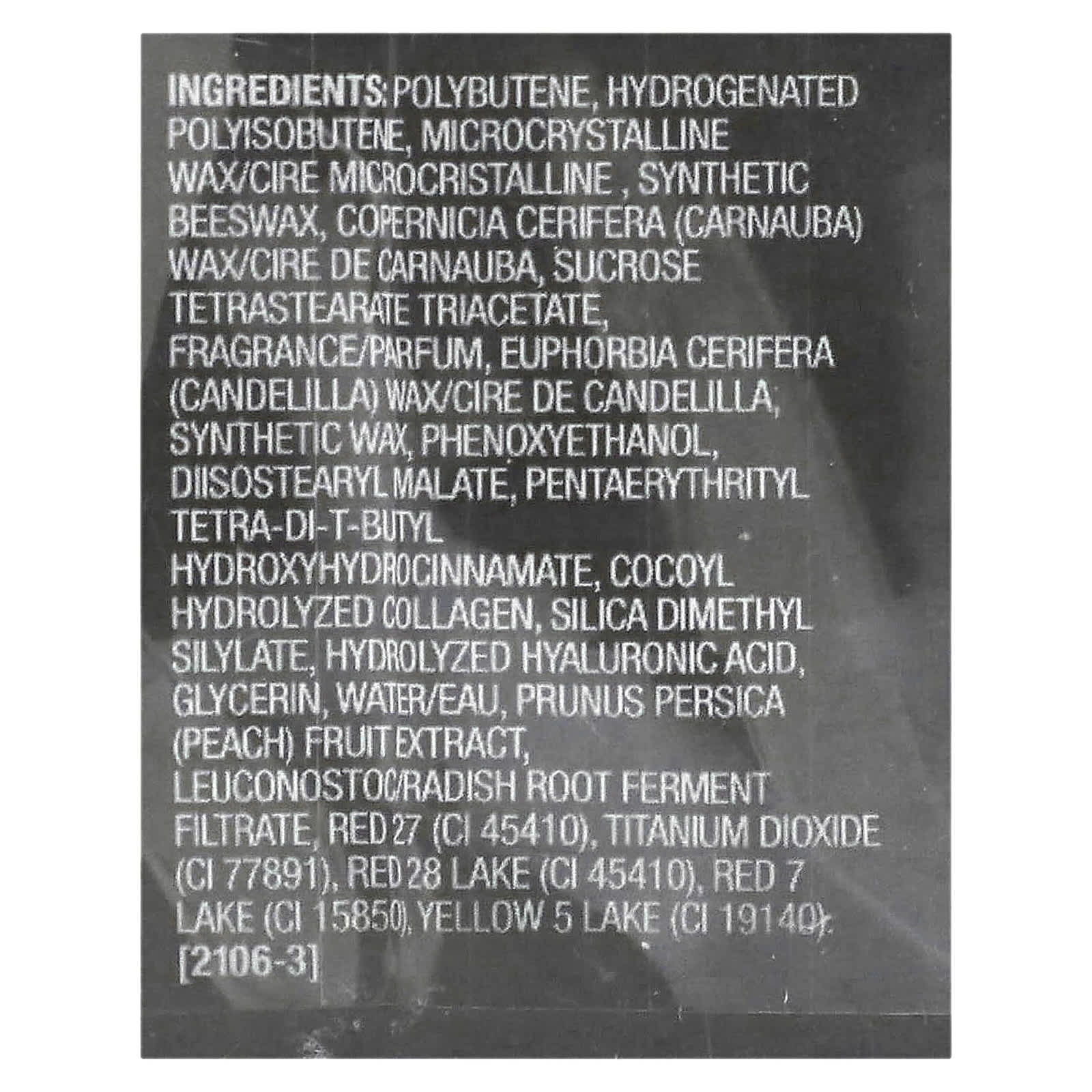 Полибутен, гидрогенизированный полиизобутен, микрокристаллический воск, синтетический воск, карнаубский воск (Copernicia cerifera), триацетат тетрастеарат сахарозы (отдушка), канделильский воск (Euphorbia cerifera); синтетический воск, феноксиэтанол диизостеарил малат, пентаэритритил тетра-ди-трет-бутил гидроксигидроциннамат, кокоил гидролизованный коллаген, диметил силилат диоксида кремния, гидролизованная гиалуроновая кислота и глицерин, вода, экстракт персика (Prunus persica), лейконосток/ферментированный фильтрат корня редиса, краситель красный 27 (CI 45410)., диоксид титана (CI 77891), лак красный28 (CI 45410), краситель красный 7 лак (CI 15850), краситель желтый 5 лак (CI 19140).