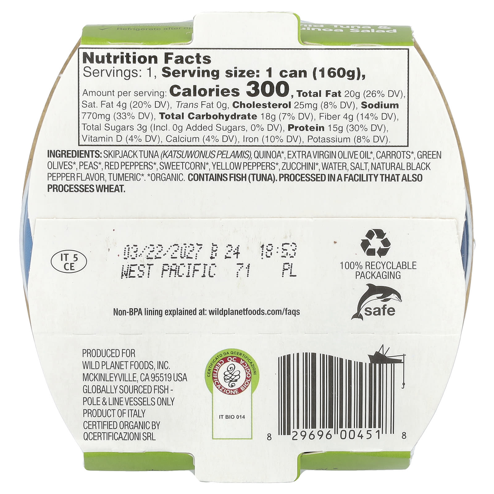 Изысканный вкус: Приготовьтесь побаловать себя нашим кулинарным салатом с диким тунцом и аппетитной смесью из органической киноа, моркови, зеленых оливок, гороха, болгарского перца, кукурузы, цукини и специй в органическом оливковом масле первого холодного отжима.