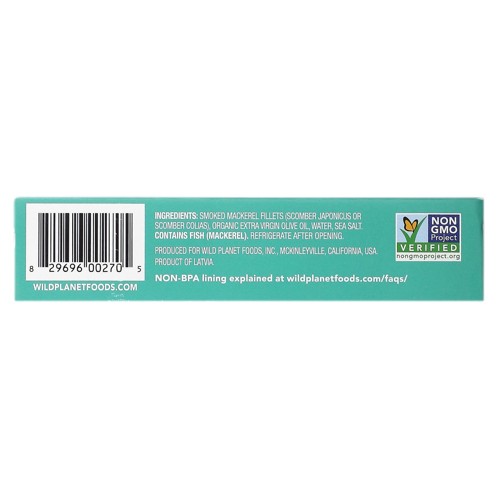 Копченое филе скумбрии (scomber japonicus или scomber colias), органическое нерафинированное оливковое масло высшего качества, вода, морская соль.