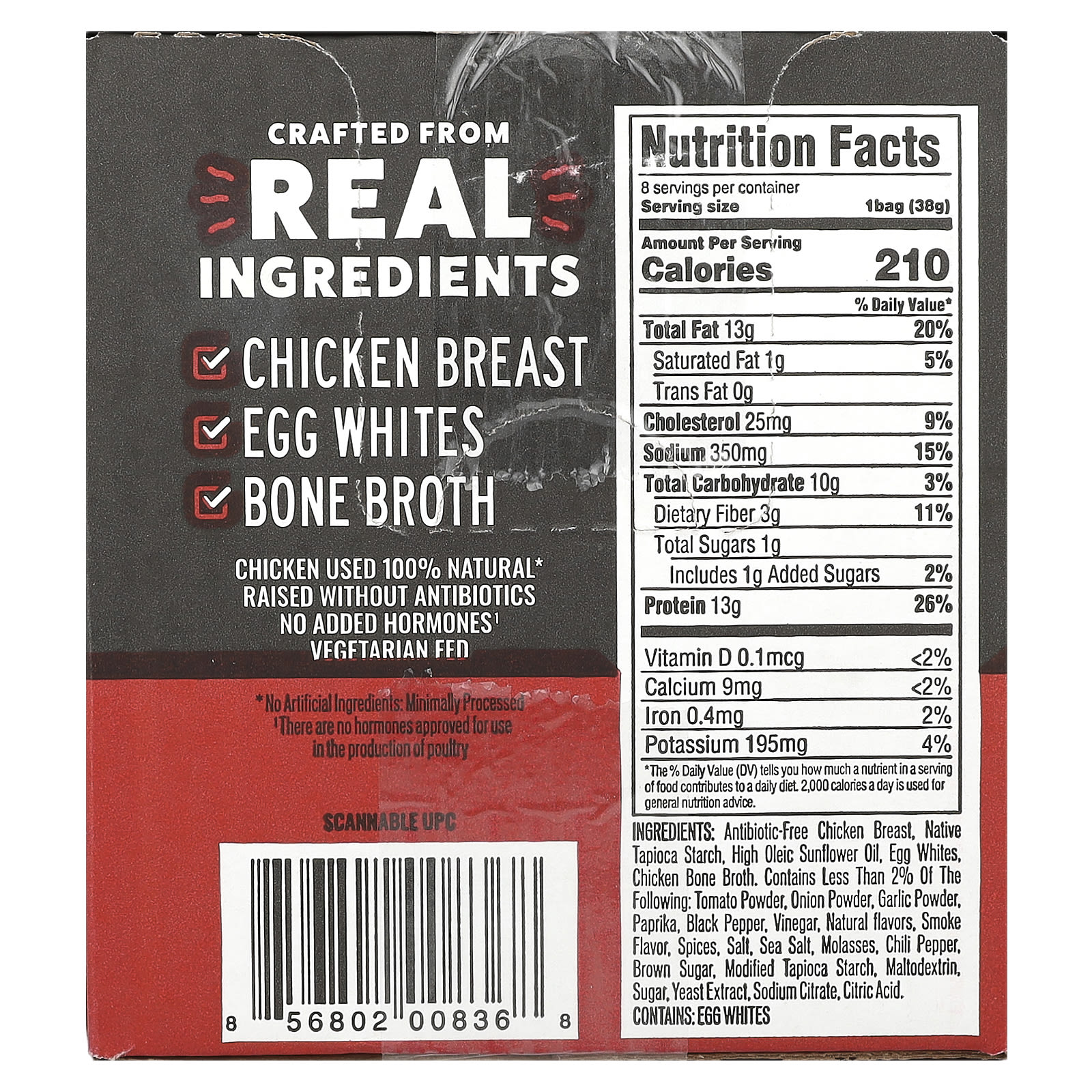 Куриная грудка без антибиотиков, натуральный тапиоковый крахмал, подсолнечное масло с высоким содержанием олеина, яичный белок, бульон из куриных костей. содержит менее 2% следующих ингредиентов: томатный порошок, луковый порошок, чесночный порошок, паприка, черный перец, уксус, натуральные ароматизаторы, ароматизатор «дым», специи, соль, морская соль, патока, перец чили, коричневый сахар, модифицированный тапиоковый крахмал, мальтодекстрин, сахара, экстракт дрожжей, цитрат натрия, лимонная кислота.