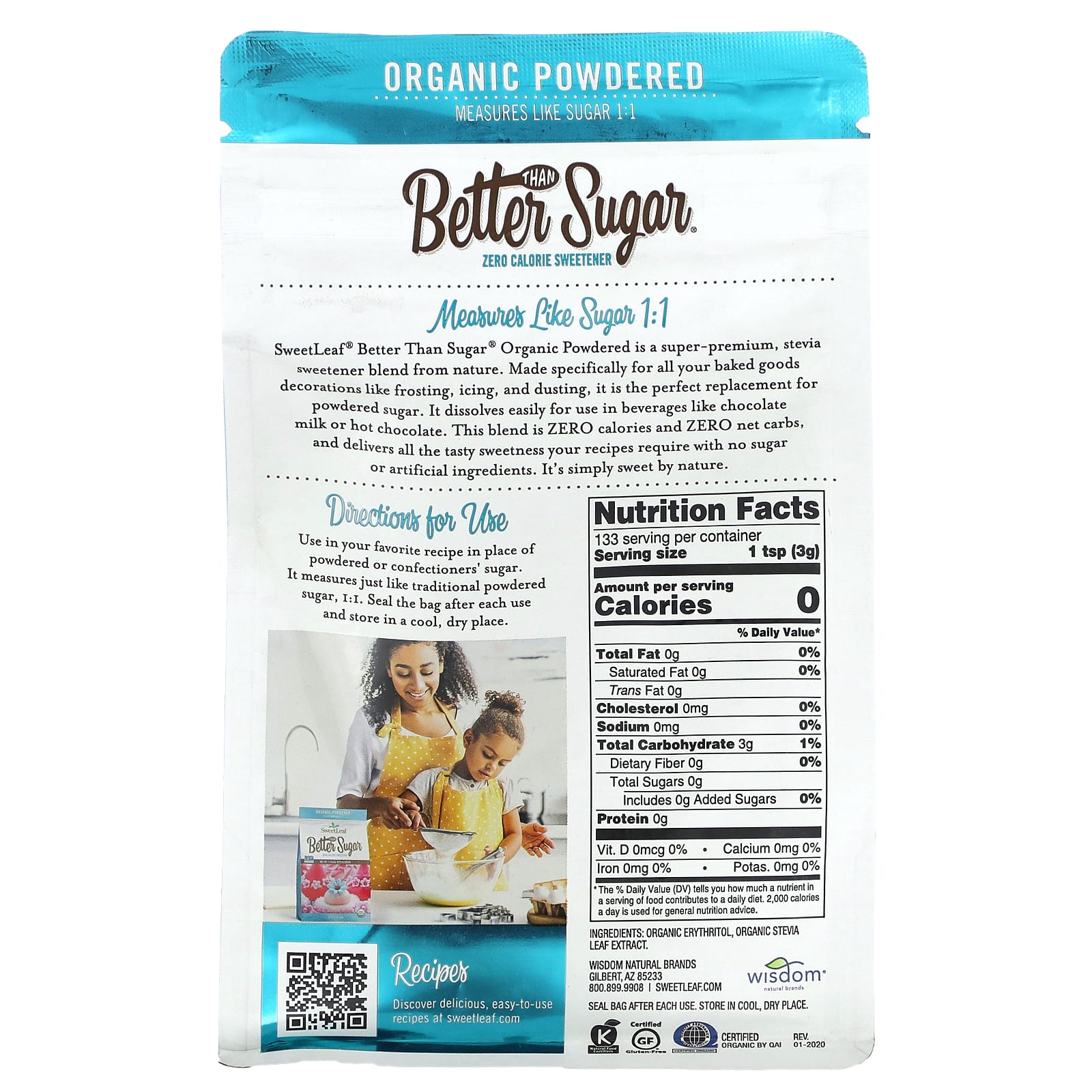 SweetLeaf® Better Than Sugar® Organic Powdered - это натуральная смесь подсластителей на основе стевии премиального качества. Созданный специально для украшения выпечки, например, для глазури, глазури и присыпки, он является идеальной заменой сахарной пудры. Легко растворяется и подходит для использования в таких напитках, как шоколадное молоко или горячий шоколад. Эта смесь НЕ содержит калорий и чистых углеводов, она обеспечивает всю вкусную сладость, требуемую по вашим рецептам, без сахара или искусственных ингредиентов. Это просто сладко от природы.