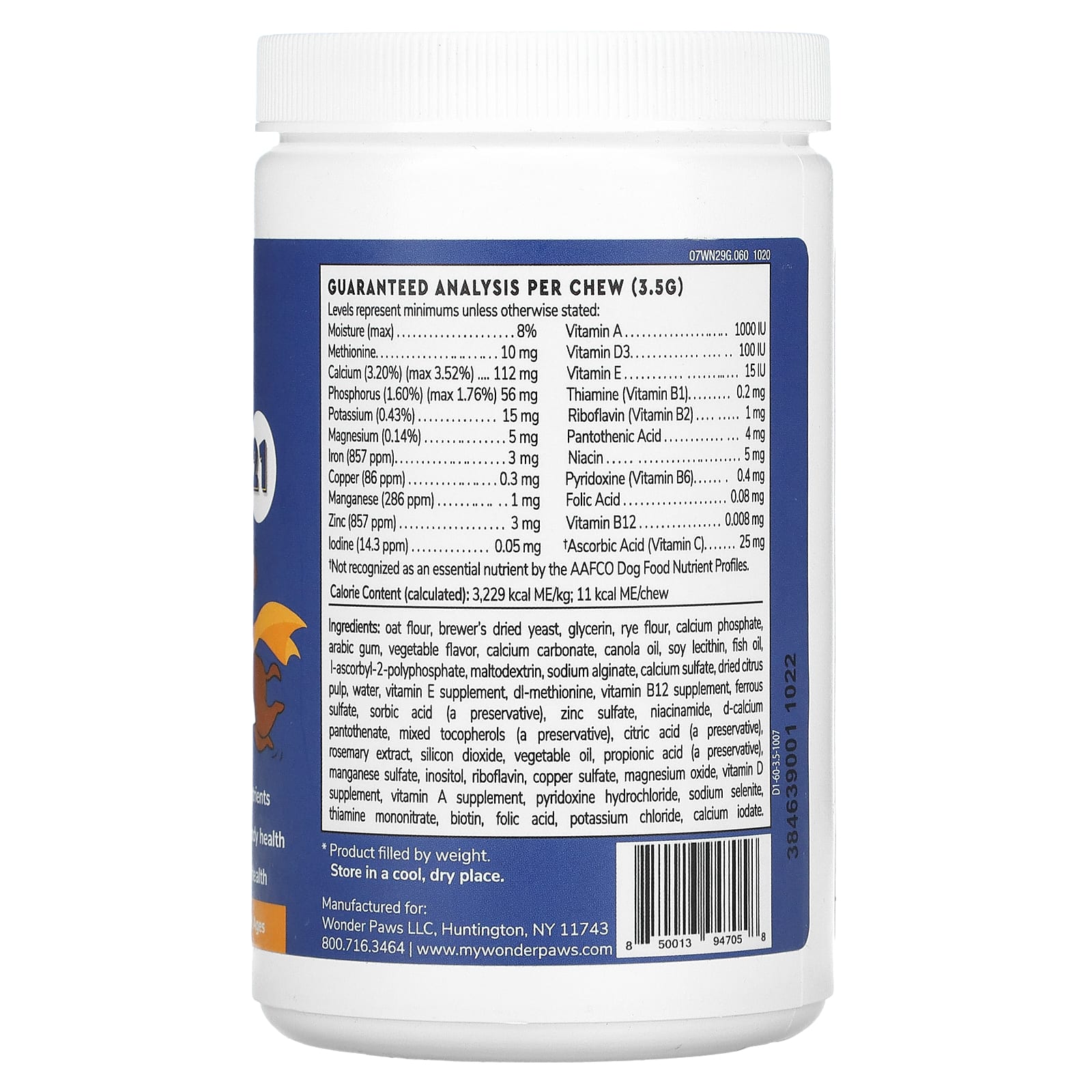 Овсяная мука, пивные сухие дрожжи, глицерин, ржаная мука, карбонат кальция, рапсовое масло, соевый лецитин, рыбий жир, l-аскорбил-2-полифосфат, мальтодекстрин, альгинат натрия, сульфат кальция, сухая цитрусовая пульпа, вода, добавленный витамин Е, DL-метионин, добавленный витамин В12, железо, сульфат, сорбиновая кислота (консервант), сульфат цинка, никотинамид, d-пантотенат кальция, смешанные токоферолы (консервант), лимонная кислота (консервант), сульфат марганца, инозитол, рибофлавин, сульфат меди, оксид магния, добавленный витамин D, добавленный витамин A, пиридоксина гидрохлорид, селенит натрия, тиамина мононитрат, биотин, фолиевая кислота, хлорид калия, йодид кальция.