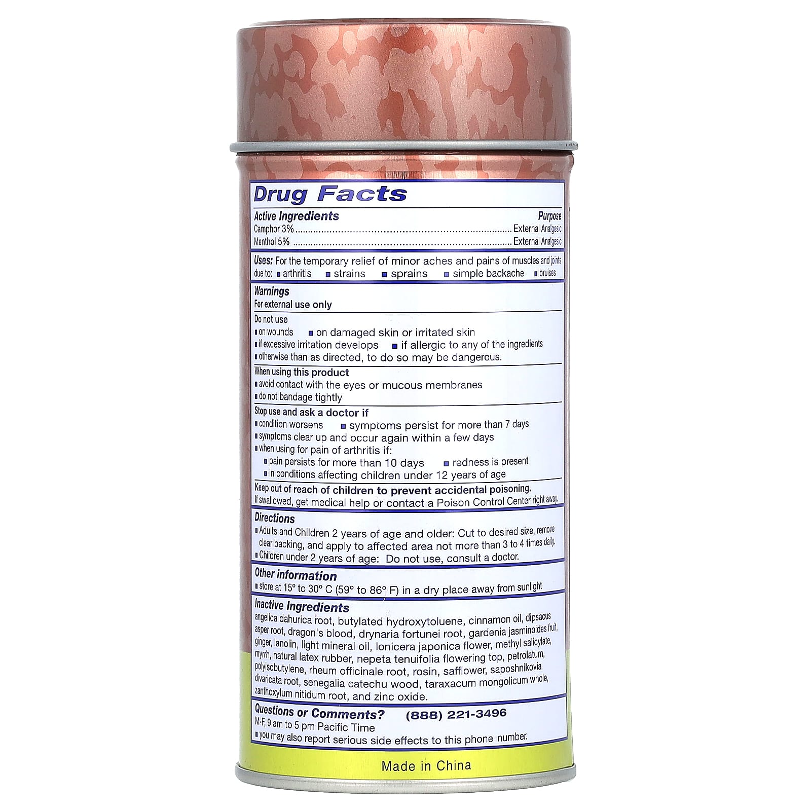 | корень дудника даурского (Angelica dahurica), бутилированный гидрокситолуол, масло корицы, корень дипсакуса, кровь питахайи, корень сухофрукта форвиты, плоды гардении жасминоидной (Gardenia jasminoides), имбирь, ланолин, легкое минеральное масло, цветы жимолости японской (Lonicera japonica), метилсалицилат, мирра, натуральный латексный каучук, цветущая верхушка непеты тонколистной , вазелин, полиизобутилен, корень ревеня (Rheum officinale), канифоль, сафлор, корень сапошниковы (Saposhnikia divaricata), древесина сенегалии катеху (Taraxacum mongolicum), корень зантоксилума (Zanthoxylum nitidum) и оксид цинка. | |
