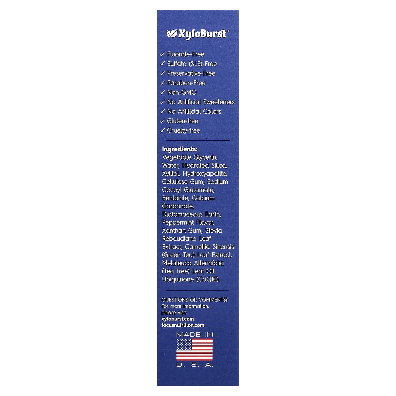 Зубная паста тройного действия XyloBurst с ксилитолом сочетает в себе полезные свойства коэнзима Q10, экстракта зеленого чая и масла чайного дерева, которые безопасно и эффективно освежают дыхание, уменьшают налет и отбеливают зубы.
