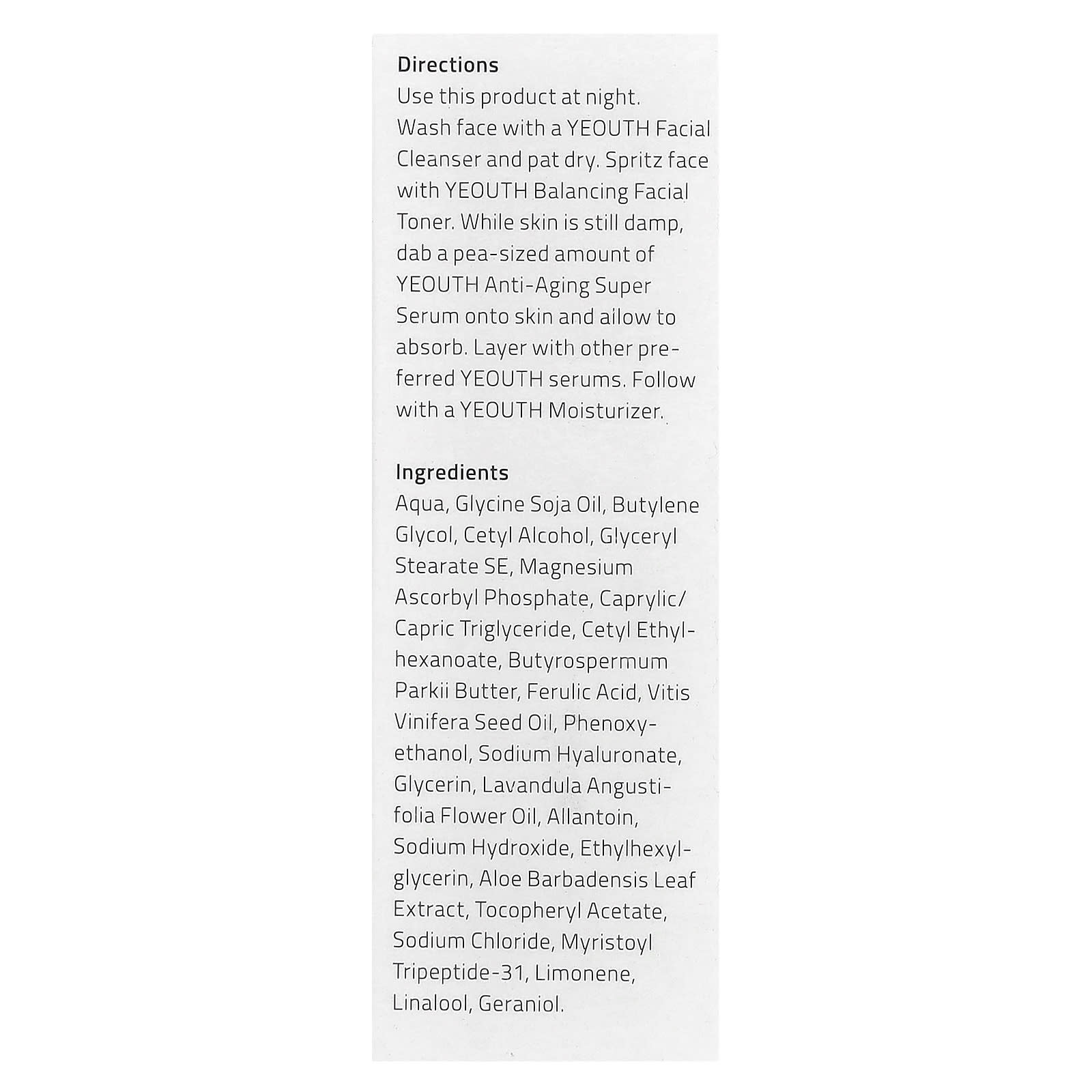 Используйте этот продукт на ночь. Умойтесь очищающим средством для лица от YEOUTH и промокните кожу насухо. Нанесите восстанавливающий баланс тоник для лица YEOUTH. Похлопывающими движениями нанесите на кожу антивозрастную суперсыворотку YEOUTH размером с горошину и дайте ей впитаться. Далее наносите другие сыворотки от YEOUTH, которые вы предпочитаете. Затем нанесите увлажняющий крем YEOUTH.