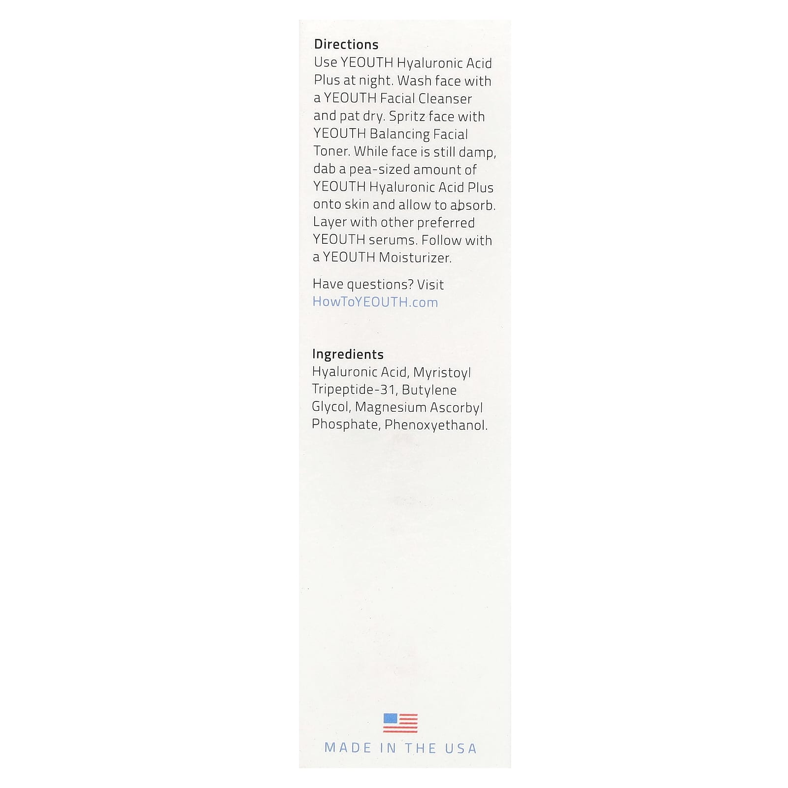 Используйте вечером с гиалуроновой кислотой YEOUTH. Умойтесь очищающим средством для лица от YEOUTH и промокните кожу насухо. Нанесите восстанавливающий баланс тоник для лица YEOUTH. Похлопывающими движениями нанесите небольшое количество гиалуроновой кислоты YEOUTH Hyaluronic Acid Plus на влажную кожу и дайте ей впитаться. Далее наносите другие сыворотки от YEOUTH, которые вы предпочитаете. Затем нанесите увлажняющий крем YEOUTH.