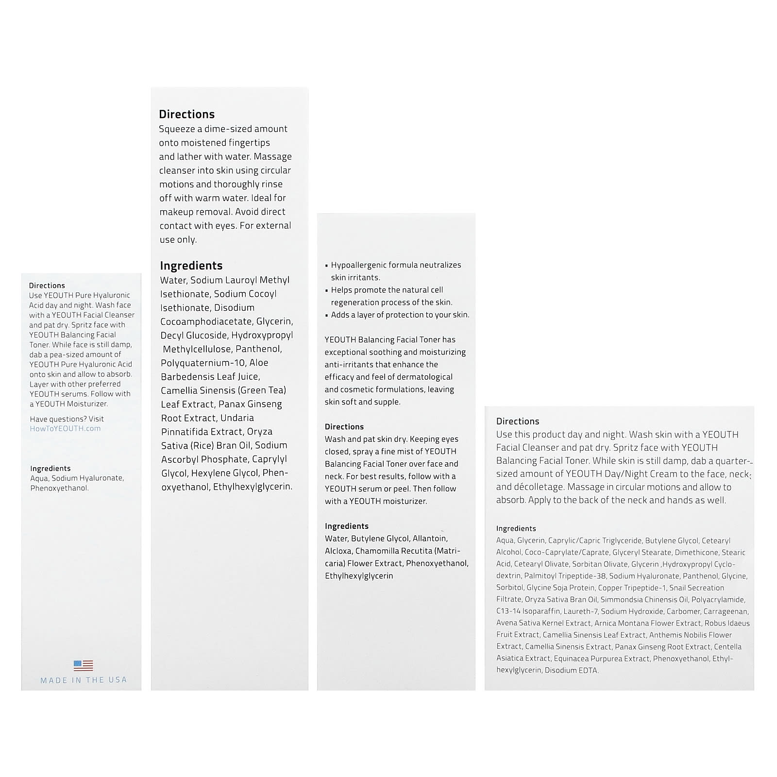 Все продукты YEOUTH содержат стабильные, высококачественные, клинически протестированные ингредиенты, которые взаимодействуют друг с другом. Хотя все наши продукты разработаны для улучшения внешнего вида кожи, каждый из них действует по-своему.