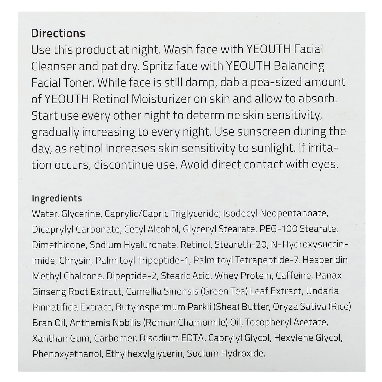 Используйте этот продукт вечером. Умойте лицо очищающим средством YEOUTH Facial Cleanser и промокните насухо. Распылите на лицо тонизирующее средство YEOUTH Balancing Facial Toner. Пока кожа еще влажная, нанесите на нее увлажняющий крем с ретинолом YEOUTH Retinol Moisturizer размером с горошину и дайте впитаться. Начните использовать через вечер, чтобы определить чувствительность кожи, затем постепенно переходите к ежедневному применению. В течение дня обязательно используйте солнцезащитное средство, так как ретинол повышает чувствительность кожи к солнечному свету.