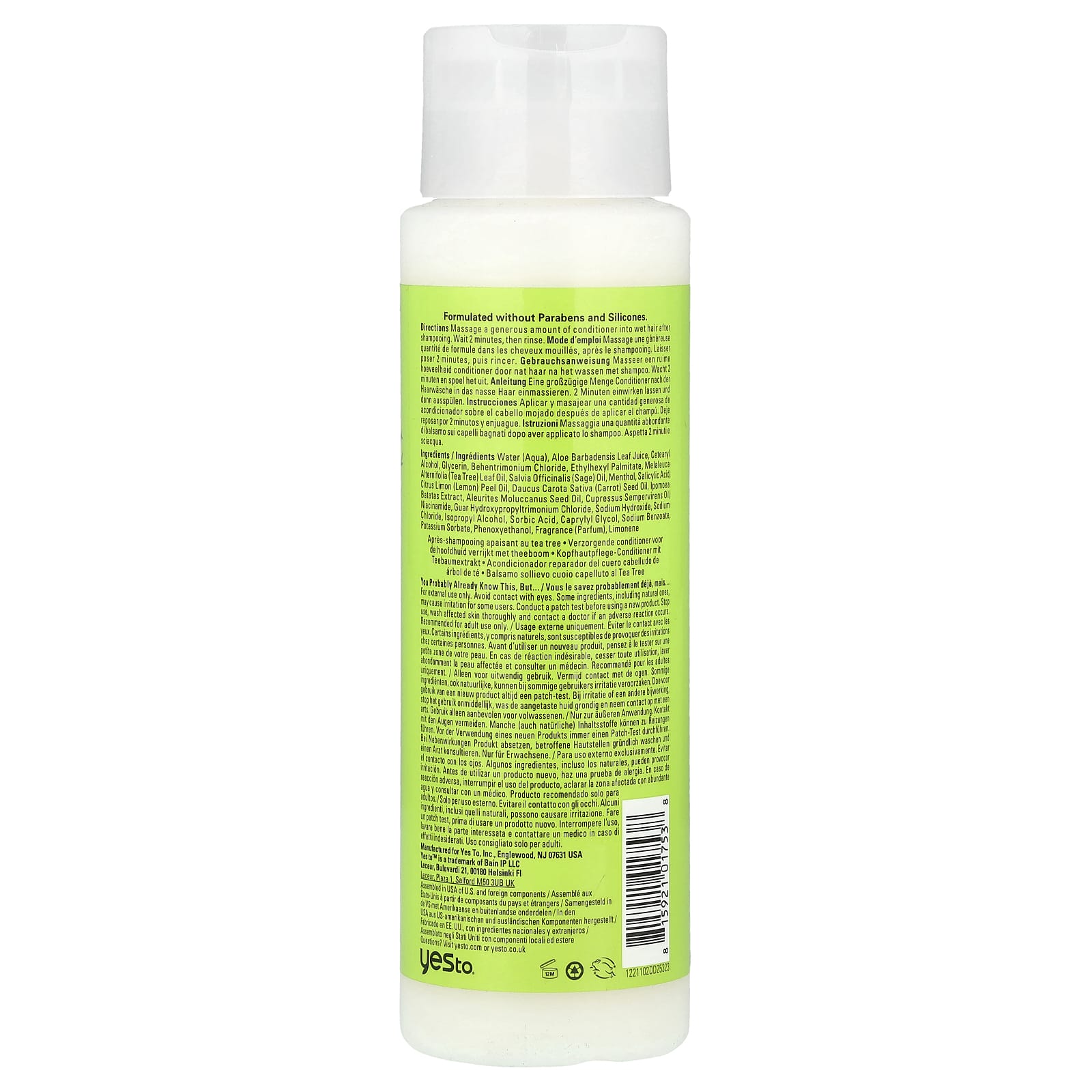 Вода (Aqua), сок из листьев алоэ вера (Aloe barbadensis), цетеариловый спирт, глицерин, бегентримония хлорид, этилгексил пальмитат, масло из листьев чайного дерева (Melaleuca alternifolia), масло шалфея (Salvia officinalis), ментол, салициловая кислота, масло из цедры лимона (Citrus limon), масло из семян моркови (Daucus carota sativa), экстракт ипомеи бататас, масло семян алеврита (Aleurites moluccanus), Cupressus sempervirens масло, никотинамид, гуар гидроксипропилтримония хлорид, гидроксид натрия, хлорид натрия, изопропиловый спирт, сорбиновая кислота, каприлилгликоль, бензоат натрия, сорбат калия, феноксиэтанол, отдушка (парфюмерная композиция), лимонен.