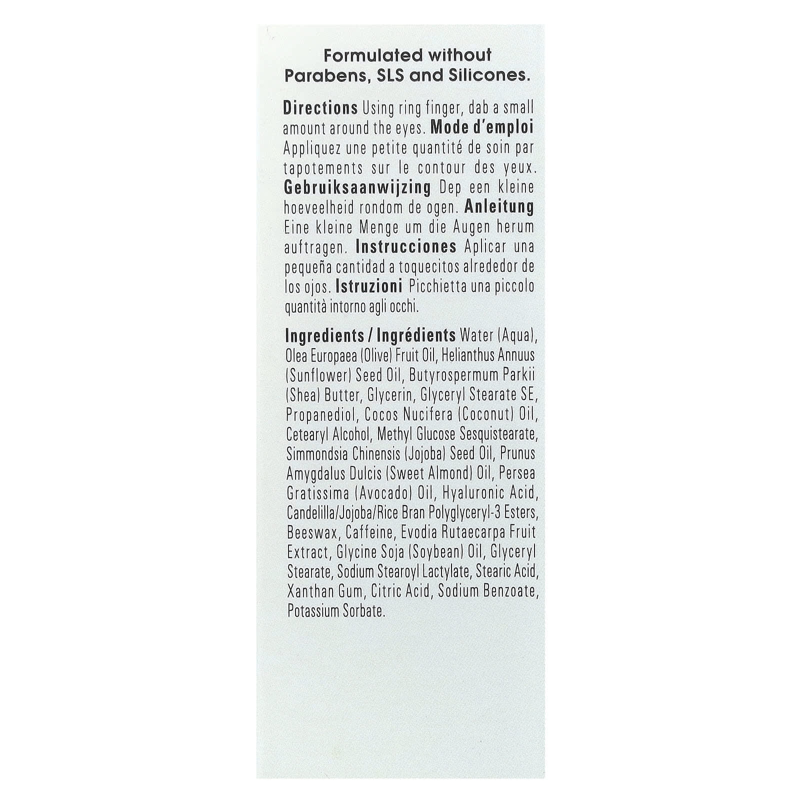 Вода (Aqua), оливковое масло (Olea europaea), подсолнечное масло (Helianthus annuus), масло ши (Butyrospermum parkii), глицерин, глицерил стеарат эмульгирующий, пропандиол, кокосовое масло (Cocos nucifera), цетеариловый спирт, метилглюкозы сесквистеарат, масло из семян жожоба (Simmondsia chinensis), масло сладкого миндаля (Prunus amygdalus dulcis), масло авокадо (Persea gratissima), гиалуроновая кислота, полиглицерил-3 эфиры канделильи / жожоба / рисовых отрубей, пчелиный воск, кофеин, экстракт плодов эводии рутэкарпы, соевое масло (Glycine soja), глицерил стеарат, стеароил-2-лактилат натрия, стеариновая кислота, ксантановая камедь, лимонная кислота, бензоат натрия, сорбат калия.