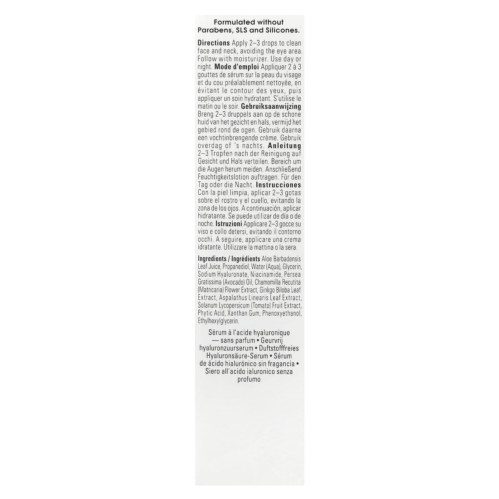 Сок из листьев алоэ вера (Aloe barbadensis), пропандиол, вода (Aqua), глицерин, гиалуронат натрия, никотинамид, масло авокадо (Persea gratissima), экстракт цветков ромашки лекарственной (Chamomilla recutita), экстракт листьев гинкго билоба (Ginkgo biloba), экстракт листьев ройбуша (Aspalathus linearis), экстракт плодов томата (Solanum lycopersicum), фитиновая кислота, ксантановая камедь, феноксиэтанол, этилгексилглицерин.