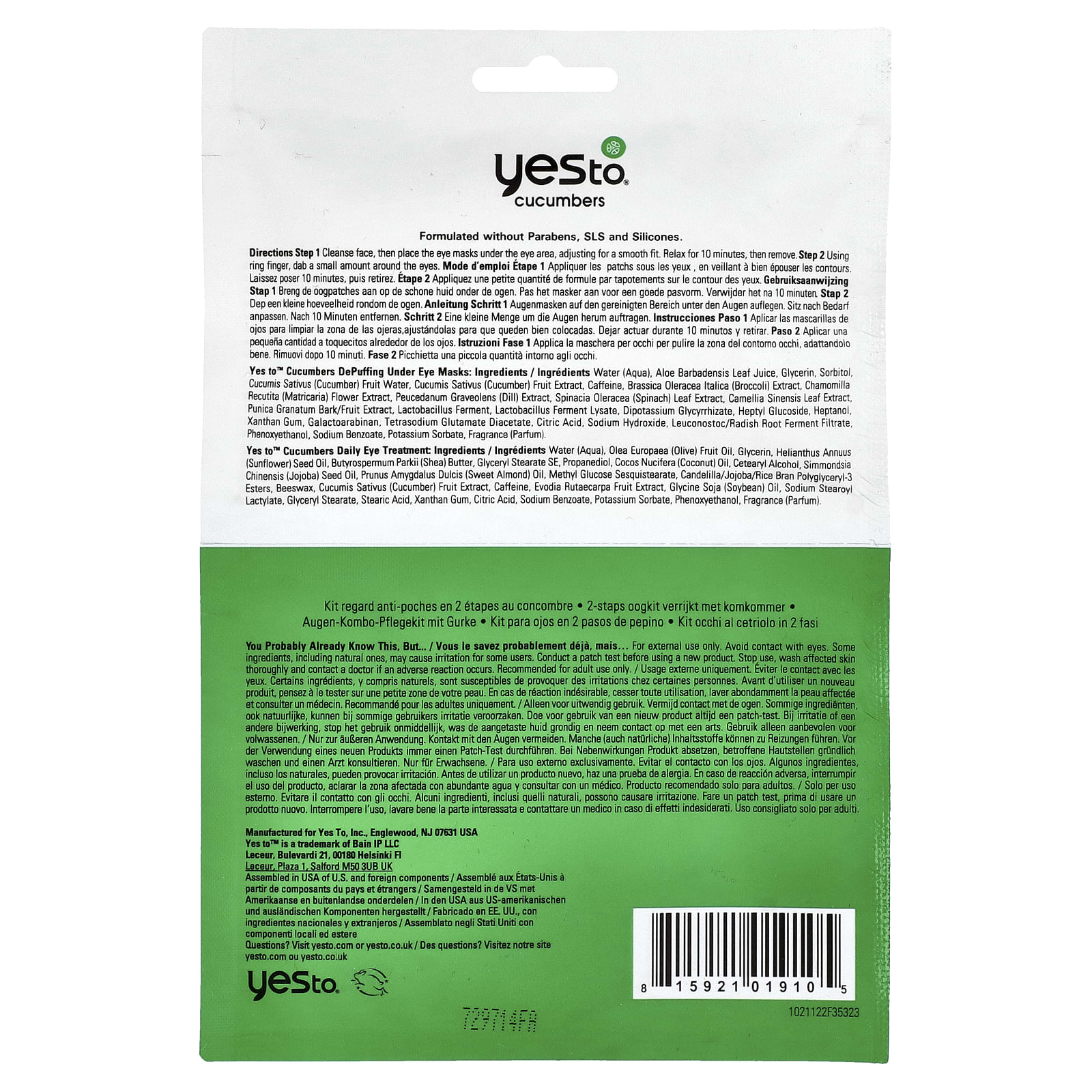 Маски для снятия отека под глазами Yes to ™: Вода (Aqua), сок из листьев алоэ вера (Aloe barbadensis), глицерин, сорбитол, огуречная вода (Cucumis sativus), экстракт плодов огурца (Cucumis sativus), кофеин, экстракт брокколи (Brassica oleracea italica), экстракт цветков ромашки лекарственной (Chamomilla recutita), экстракт укропа (Peucedanum graveolens), экстракт листьев шпината (Spinacia oleracea), экстракт листьев зелёного чая (Camellia sinensis), экстракт коры граната (Punica granatum), фермент лактобактерий (Lactobacillus), лизат фермента лактобактерий, дикалия глицирризат, гептил глюкозид, гептанол, ксантановая камедь, арабиногалактан, диацетат глутамата тетранатрия, лимонная кислота, гидроксид натрия, лейконосток/ферментированный фильтрат корня редиса, феноксиэтанол, бензоат натрия, сорбат калия, отдушка (парфюмерная композиция).