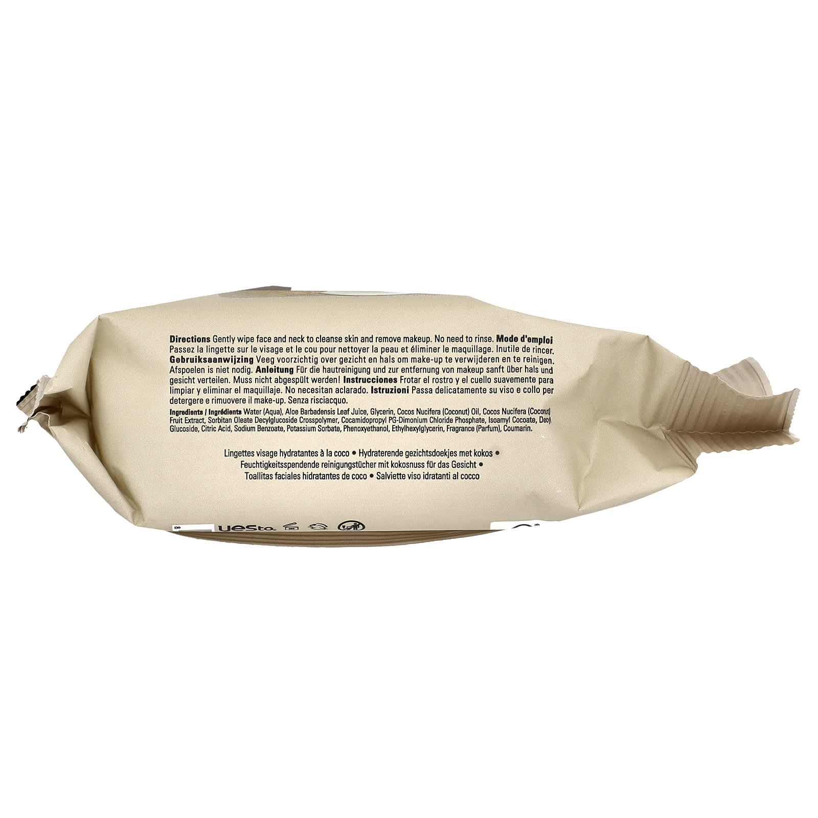 Эти салфетки идеально подходят для сухой кожи, нуждающейся в интенсивном увлажнении. Содержит кокосовую воду и экстракт орехов кукуи для мягкого очищения от загрязнений и макияжа.