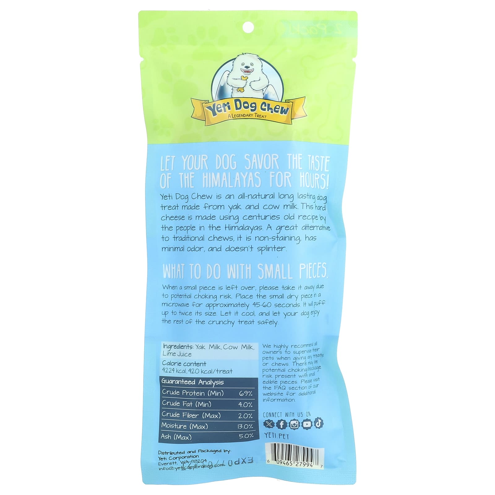 Жевательные таблетки для собак Yeti — это полностью натуральное лакомство для собак длительного действия из яка и коровьего молока. Этот твердый сыр изготавливается по старинному рецепту людьми из Гималаев. Эта отличная альтернатива традиционным жевательным таблеткам не оставляет пятен, не имеет запаха и не расщепляется.