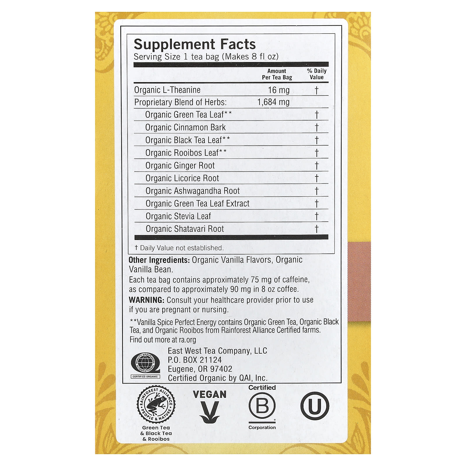 Зеленый и черный чай сочетаются с аминокислотой L-теанином и традиционно используемыми аюрведическими травами в нашем чае Vanilla Spice Perfect Energy®. Восхитительно вкусный чай со стручками ванили и экзотическими специями помогает зарядиться энергией и способствует концентрации внимания.