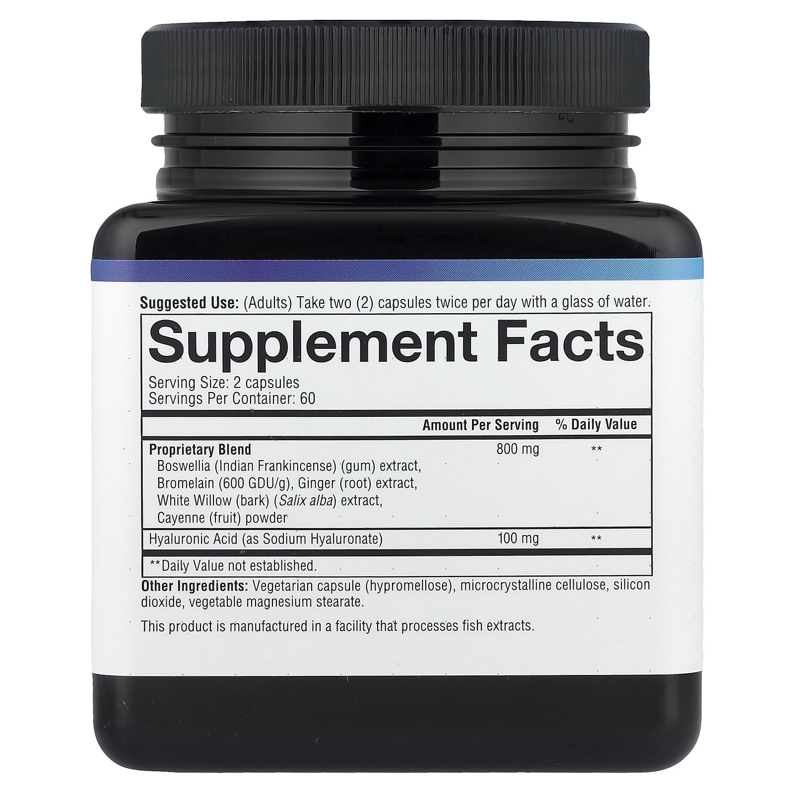 | Запатентованная смесь экстракт босвеллии (индийский ладан) (камедь), бромелаин (600 GDU/г), экстракт корня имбиря, экстракт коры ивы белой (Salix alba), порошок плодов кайенского перца | 800 мг | ** |