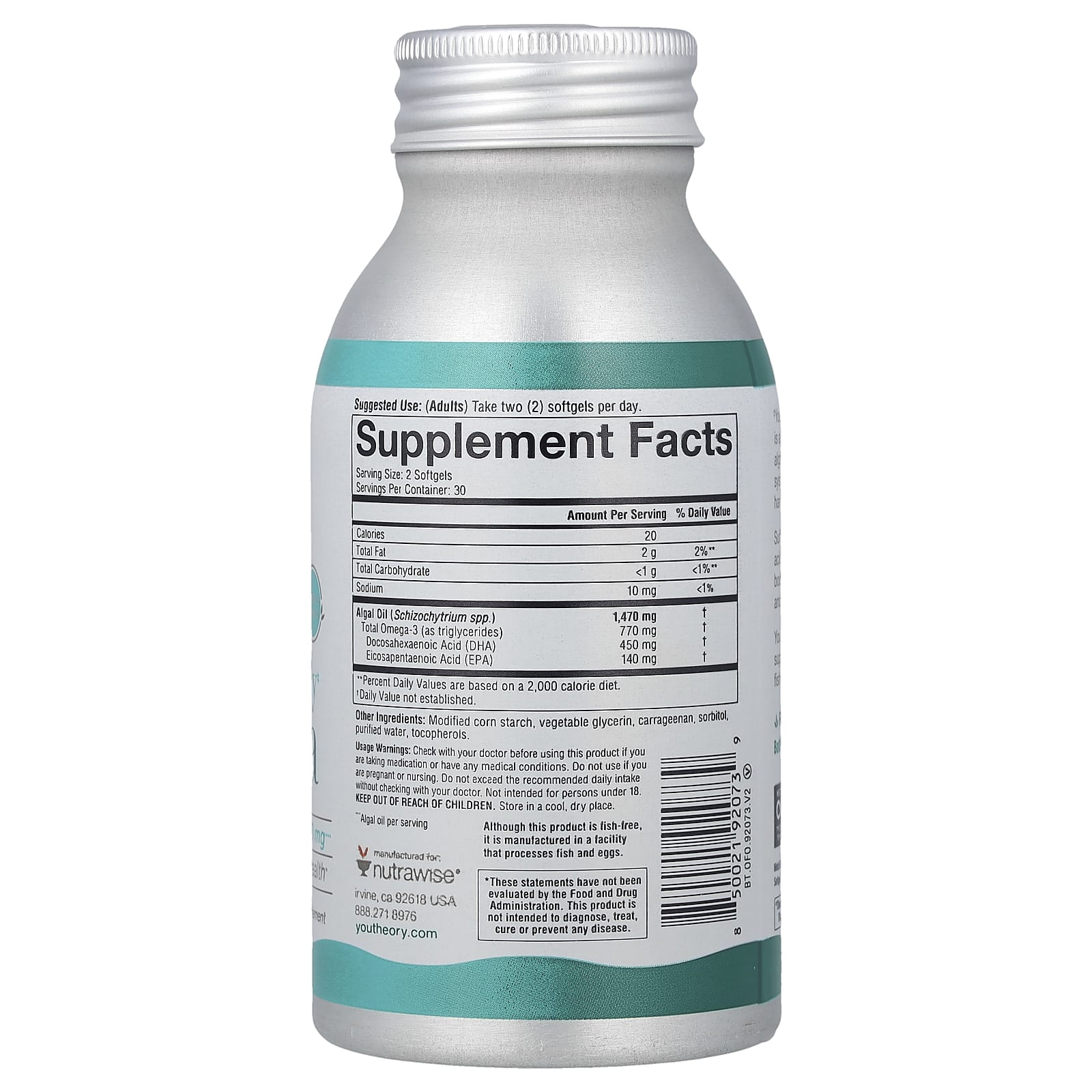 Омега для океана от Youtheory® - это растительное масло из водорослей, полученное из водорослей, выращенных в контролируемых наземных комплексах с помощью ферментации, без использования морских организмов.