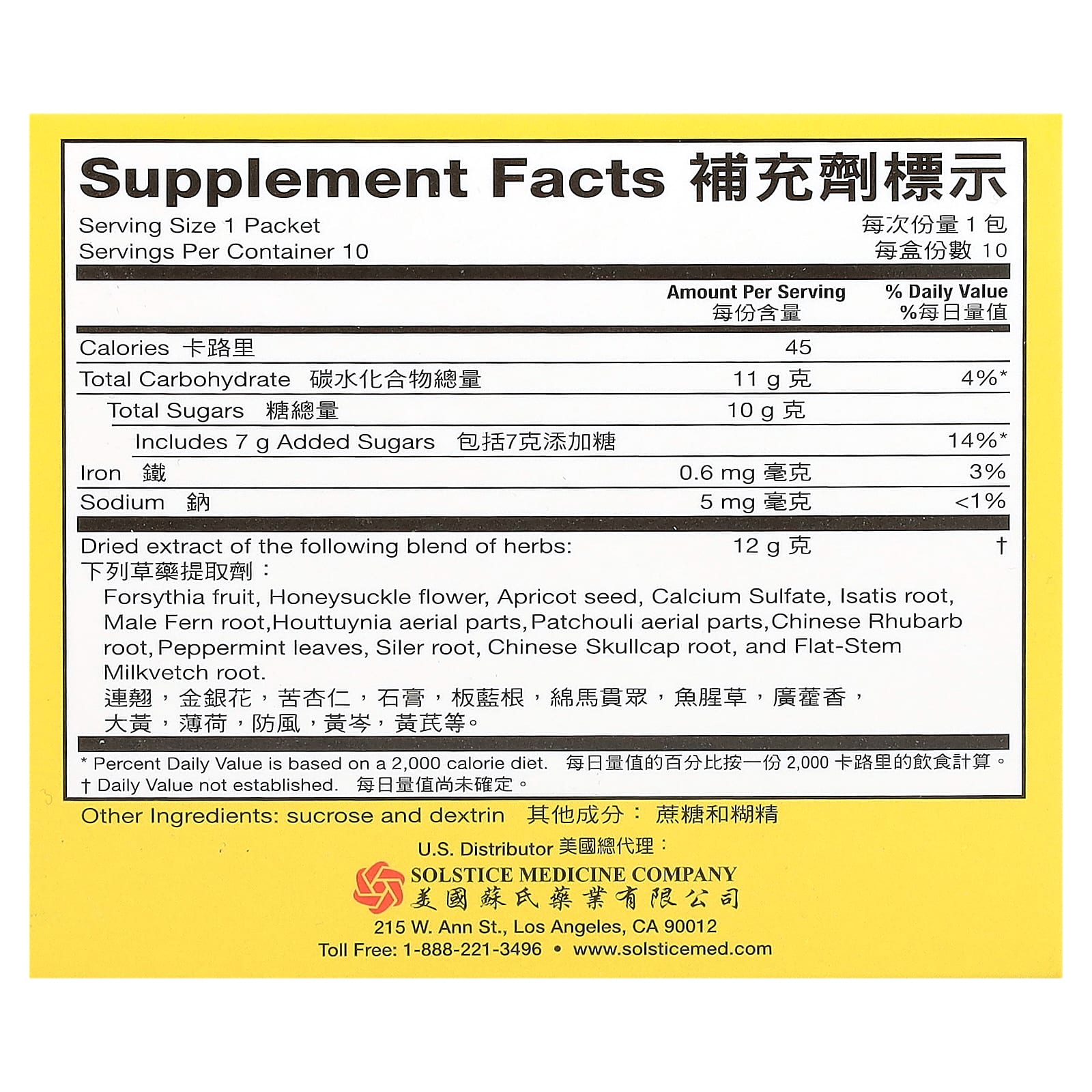 | Сухой экстракт смеси трав: плоды форзиции, цветы жимолости, семена абрикоса, сульфат кальция, корень вайды, корень мужского папоротника, надземные части хауттюйнии, надземные части пачули, корень ревеня китайского, листья перечной мяты, корень шлемника, корень шлемника китайского и корень горца многоцветкового. | 12 г | † |